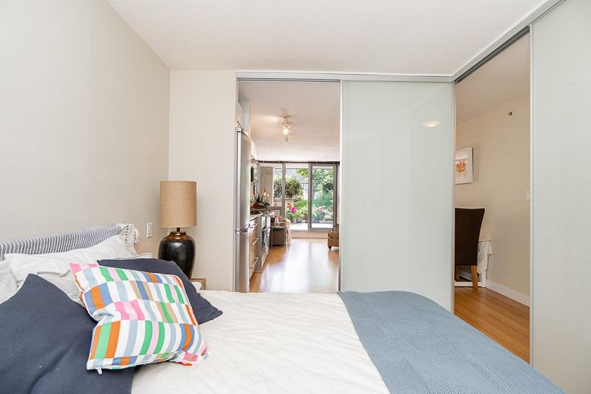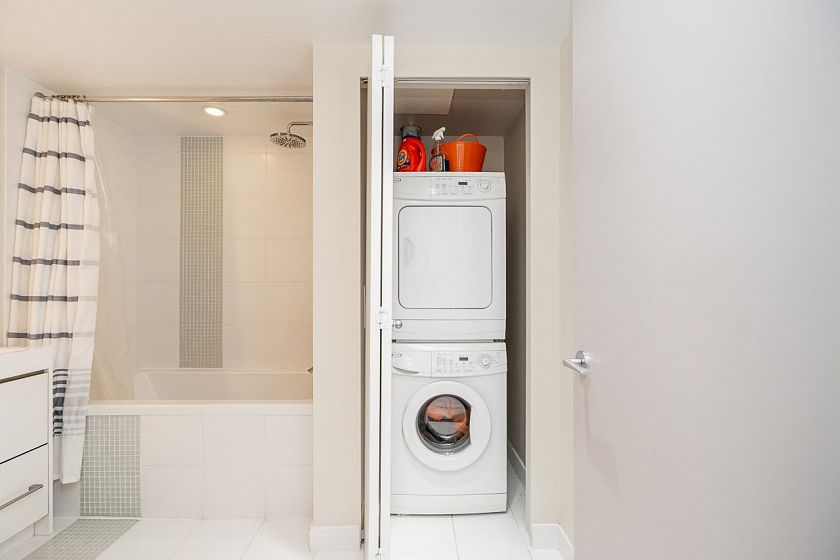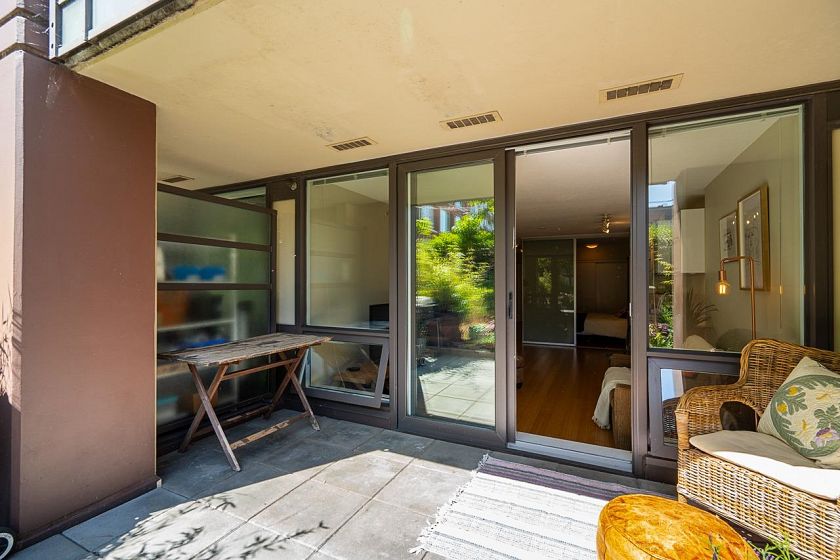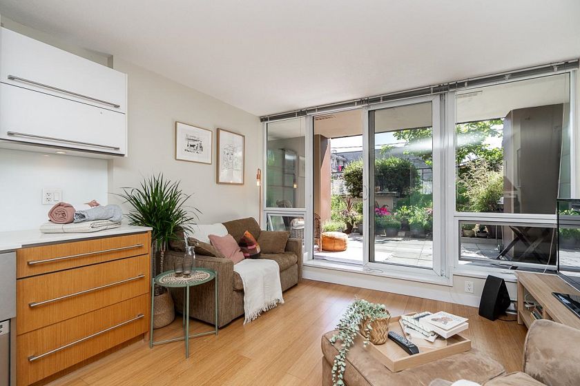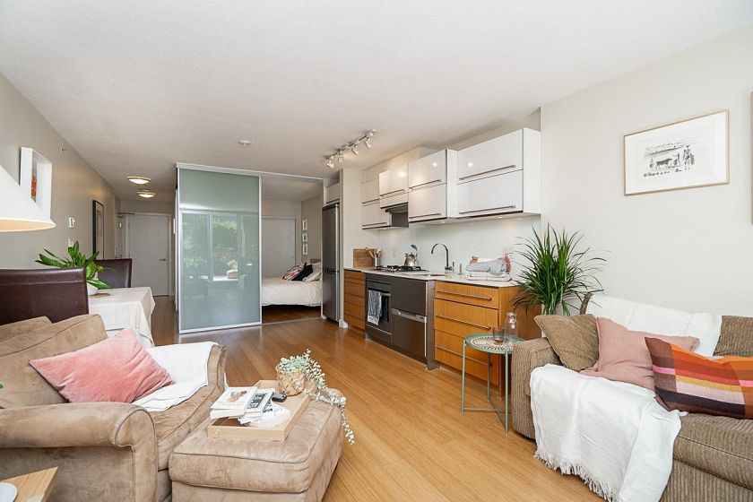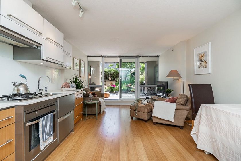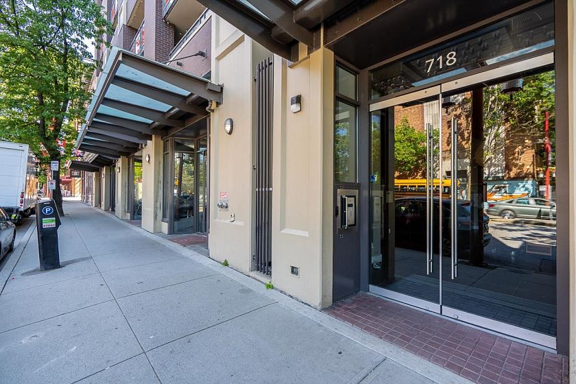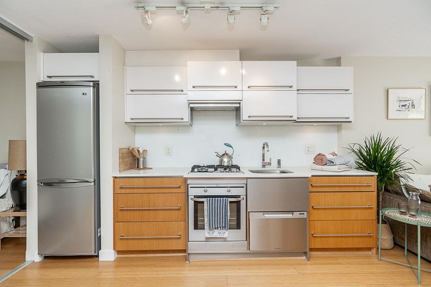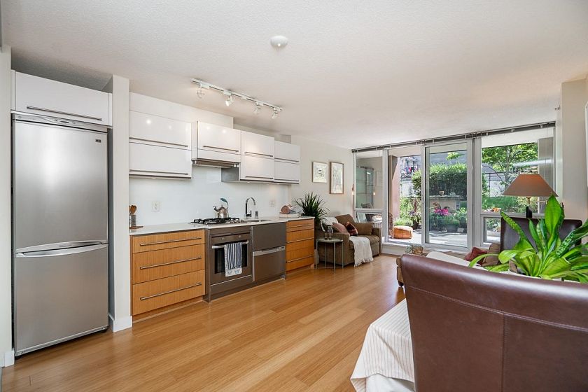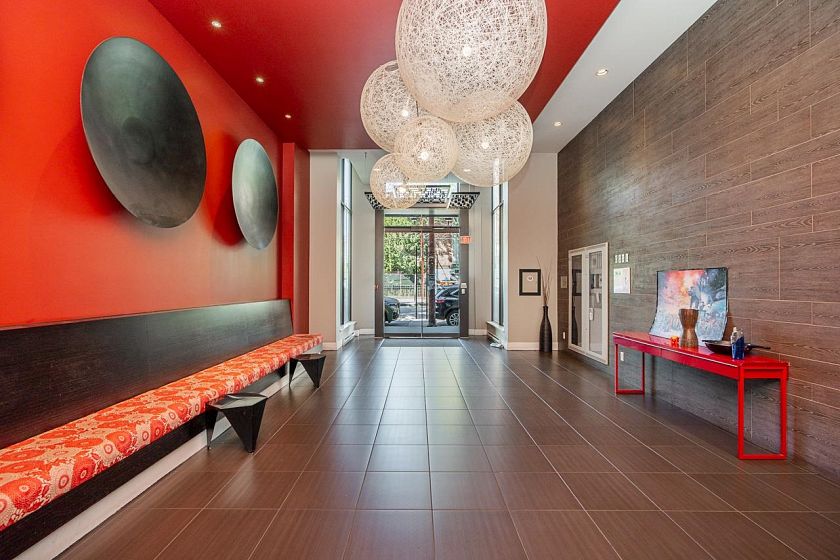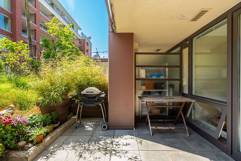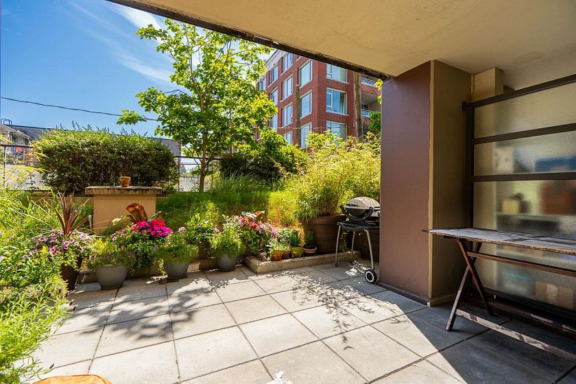 Welcome to GINGER in vibrant Crosstown- This home is perfect for first time home buyers or professionals and offers exceptional value with a large, over-sized private, BBQ-friendly patio on the quiet side of the building. Inside, you’ll find a sleek, contemporary kitchen featuring stainless steel LG appliances, a Fischer & Paykel dishwasher, hood fan & AEG Oven and cooktop. Space-saving vertically opening cabinetry, laminate flooring throughout, a sliding glass partition for the bedroom, and a spacious, spa-like bathroom complete the space. Additional highlights include in-suite storage, a stacked washer and dryer, and one secured parking stall. Rentals/ AirBnb and pets are welcome!