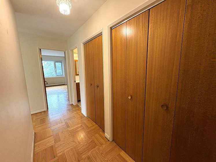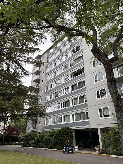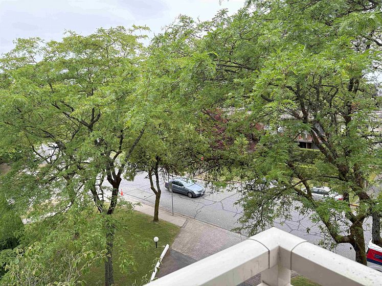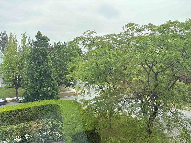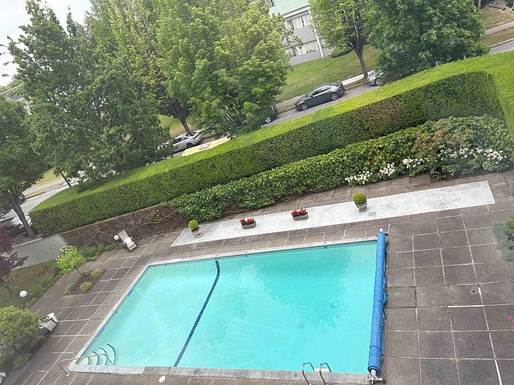 "Mansion House" - Spacious, SW facing 1 bedroom suite boasts convenience, gorgeous outlook & real privacy. This functional floor plan has lots of natural light throughout. The living room and dining room have plenty of windows with a parklike view above the outdoor pool. Kitchen has some updating and plenty of cupboard space. Very generous sized bedroom fits a king size bed and lots of closet space. Enjoy relaxing on the balcony while taking in the scenery. Shared laundry, lounge, patio & outdoor pool. Central location; close to Tisdall Park and Vandusen Gardens. Walk to Oakridge - shopping, banking, restaurants - easy access to transit Canada Line Skytrain - YVR, Richmond & downtown, UBC, Langara. Parking & storage locker. Age restricted 19+ - No pets/rentals/smoking