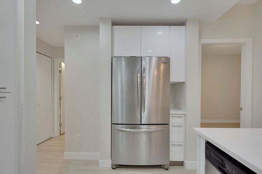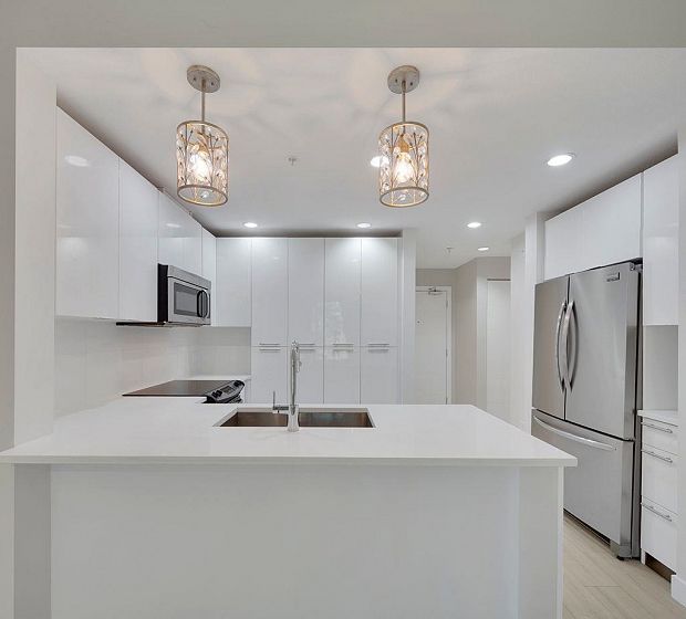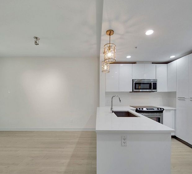 OPEN HOUSE SUNDAY, JULY 27, 12:30 - 2 PM. Bright and modern 1-bedroom + spacious den with an open layout and private balcony facing a nice, quiet creek and backing onto a peaceful green space—perfect for year-round privacy and relaxation. Features over-height ceilings, radiant in-floor heating, wide-plank laminate flooring, quartz counters, and stainless steel appliances. The den is ideal for a home office or reading nook. The Shore offers a well-equipped gym, party room, yoga studio, and playground. Enjoy local favourites like Italian Vomero Coffee House and Thomas Haas just steps away. Walkable location near shops, trails, transit, and only 10 minutes to Lonsdale Quay via Spirit Trail. Includes 1 parking and 1 locker. Pets and rentals allowed!