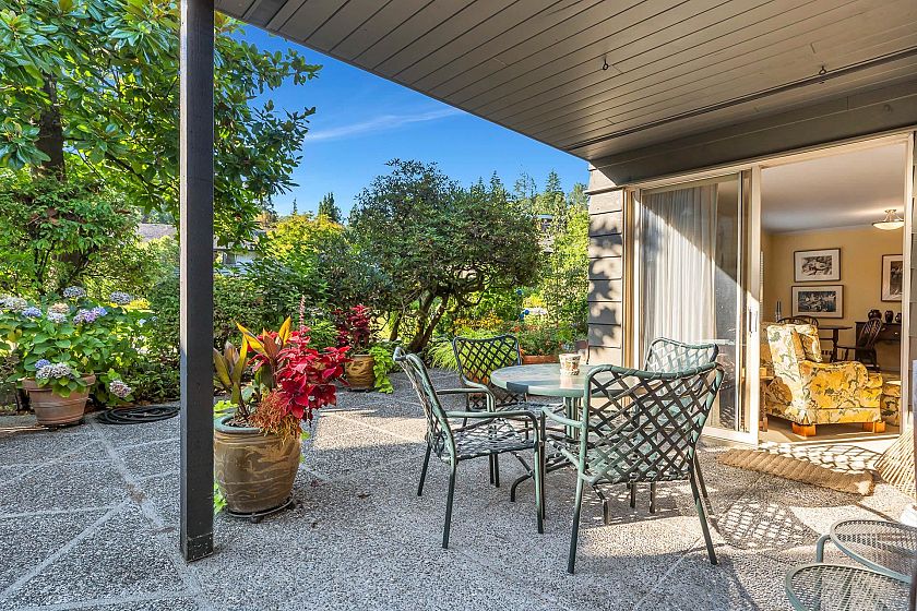 This home in Spurway Gardens is the 'Belle of the Ball' and very special. Located in the most quiet, beautiful and convenient locations within this garden oasis, this one-bedroom with private entrance feels like a townhouse. Meticulous and cared for in every way, this owner has lived in and loved this home for 44 years. This is a corner unit, measuring just under 800 sq ft with lots of glorious light and incredible gardens in plain view. The patio…oh my…measures 745 sq ft and is a seamless extension of the interior - absolutely delightful for entertaining guests and for those who love gardening. Spurway offers resort style living complete with a gorgeous outdoor pool, clubhouse and a guest suite. There really is nothing else like this on the North Shore.