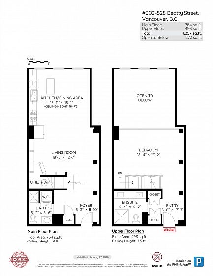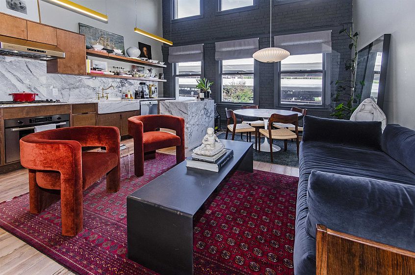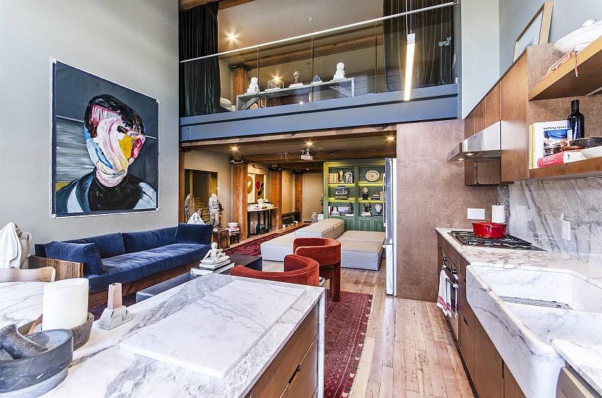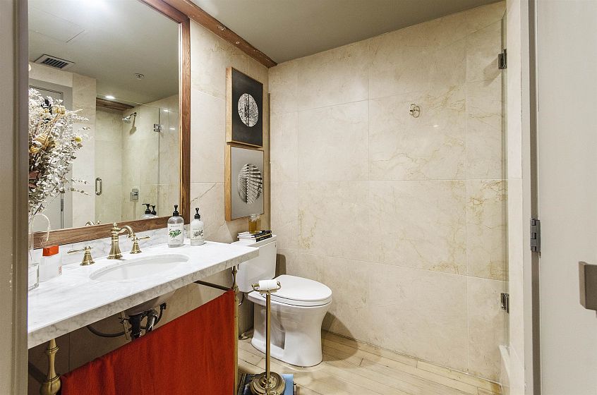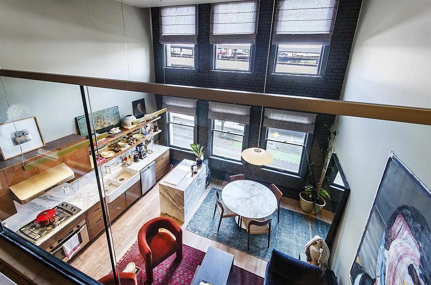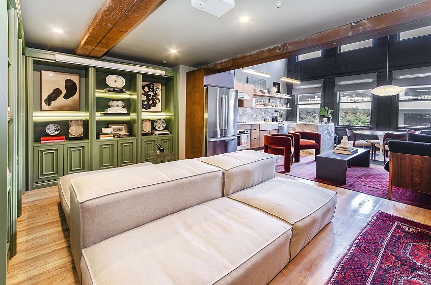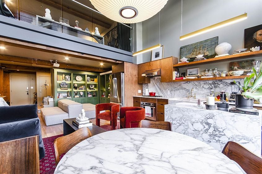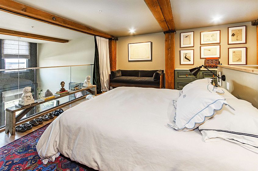 This two-storey loft at the iconic Bowman Lofts is a masterclass in style. Heritage charm meets modern refinement: exposed brick, whitewashed hardwood floors, and 20-foot ceilings with timber beams that add warmth and character. The updated kitchen features Italian Arabescato Corchia marble, walnut cabinetry, and Bosch appliances. Custom millwork bookshelves surround a reimagined area to unwind - EASILY CONVERTIBLE BACK TO A SECOND BEDROOM. Upstairs, the generous suite with secondary entrance offers custom cabinetry, luxurious curtains, and a thoughtfully redone ensuite with double sinks. The two FULL bathrooms showcase Spanish Crema Marfil marble and Toto fixtures. Secured parking within the building, storage locker, and a rooftop fireside lounge complete this one-of-a-kind opportunity.