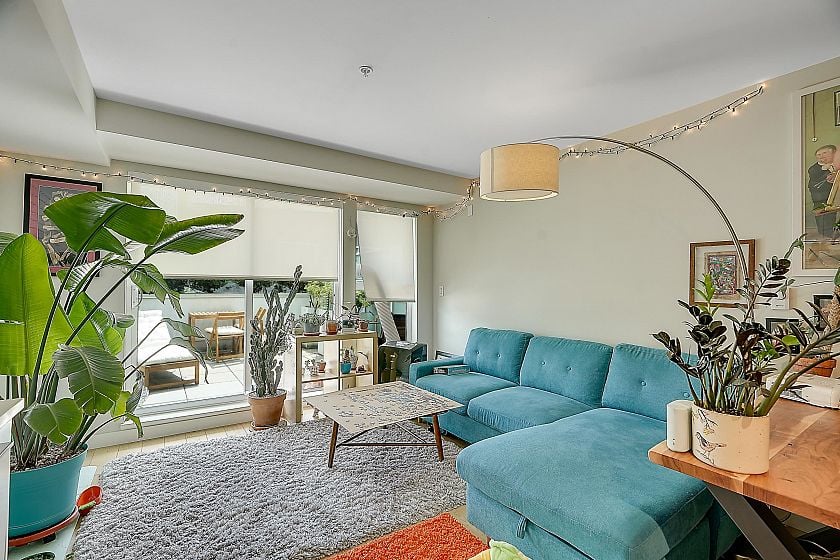 Welcome to Midtown Central by the Peterson Group/PortLiving (Studio Living).This boutique 33-unit building is perfectly located along the Broadway Corridor & Fraser Street. Situated on the quiet side of the complex features a spacious 208 sq ft patio, unobstructed. Enjoy high-end finishes throughout, including oak engineered hardwood floors, integrated appliances with induction cooktop, Carrera marble backsplash, and a luxurious bathroom with in-floor heated herringbone tile and a rain shower. The large walk-in closet doubles as a home office or flex space. Steps to shopping, restaurants, and the future Broadway Subway Station, this home is perfect for first-time buyers or investors looking for a move-in-ready property. Comes with parking, locker & bike locker.