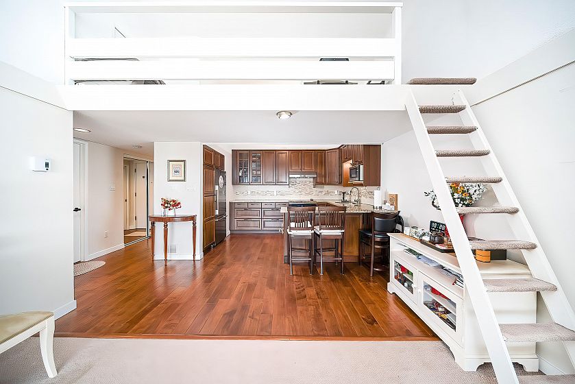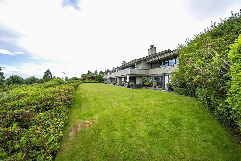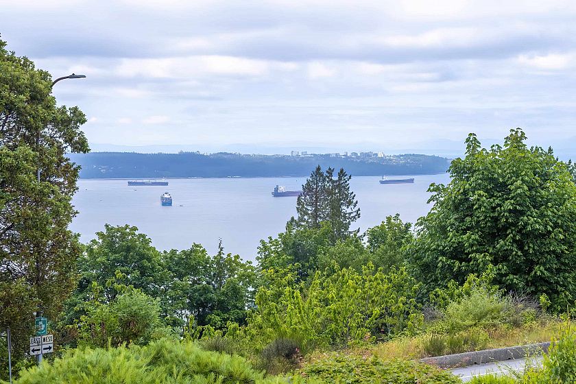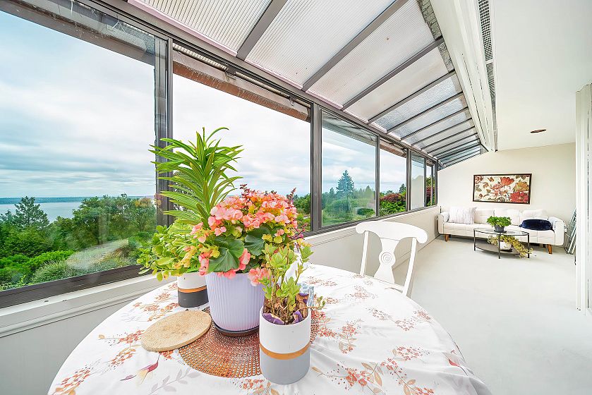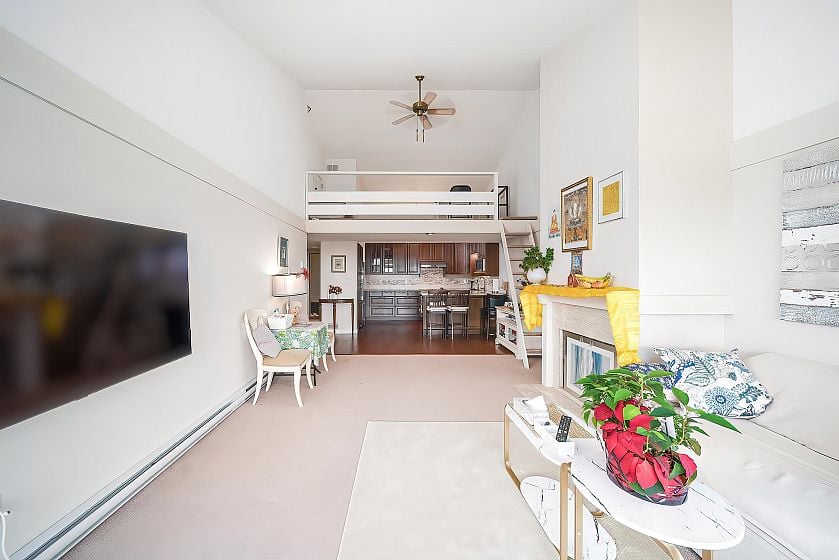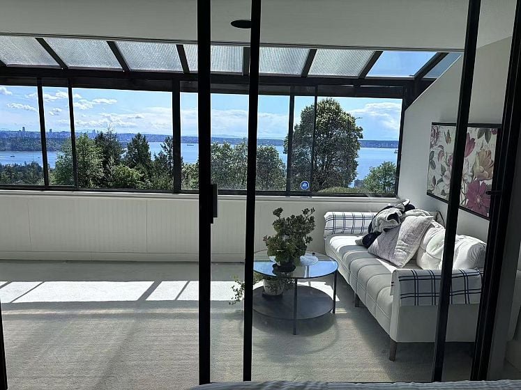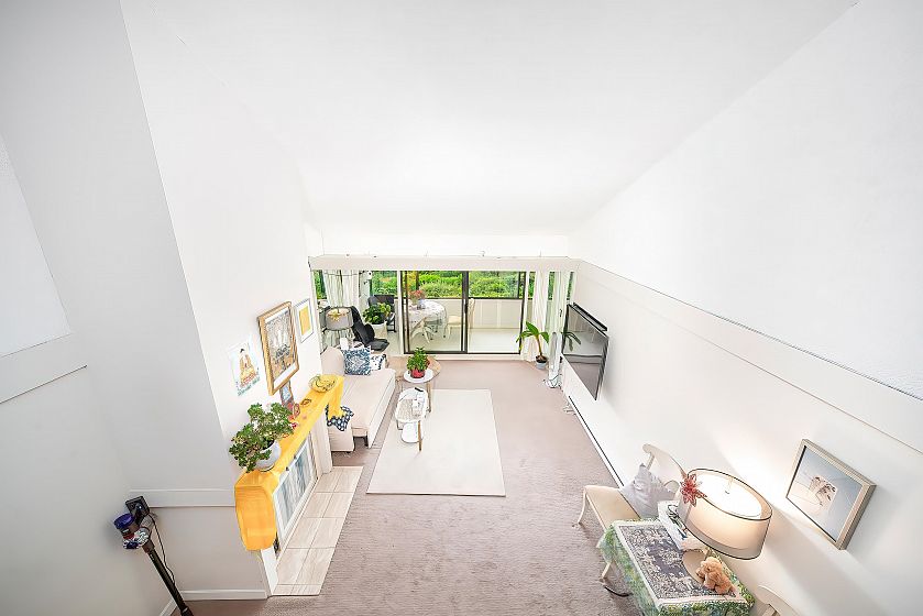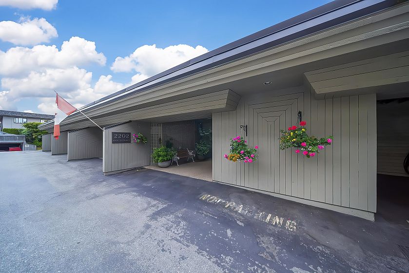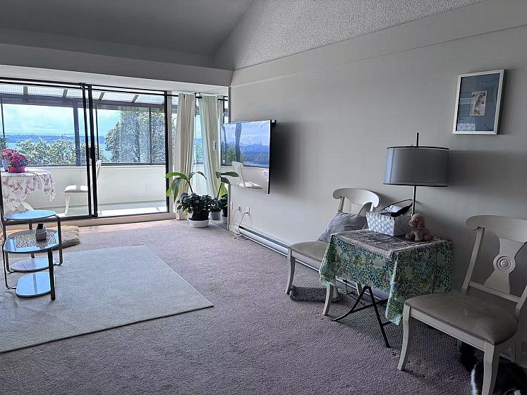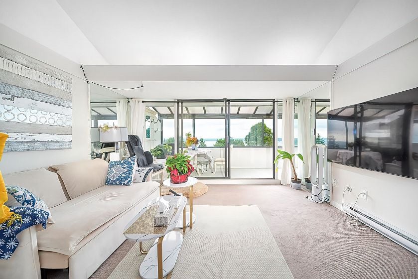 Stunning Ocean-View One-Bedroom + Loft Condo in Panorama Village! Approx. 1,045sq ft of spacious living with vaulted ceilings & open-concept layout. Enjoy unobstructed 180° water views from Mt.Baker to the Gulf Islands—true West Coast scenery at its best. Tastefully updated kitchen and cozy wood-burning fireplace, perfect for comforts and entertaining. Convenient level entry with no elevators needed—ideal for move-in ease. Rare building of just 8 suites, offering a community feel plus great storage & covered parking.