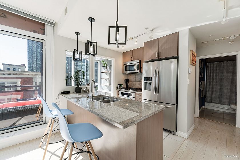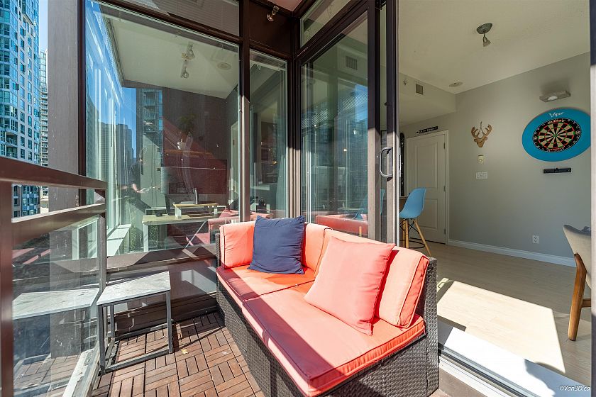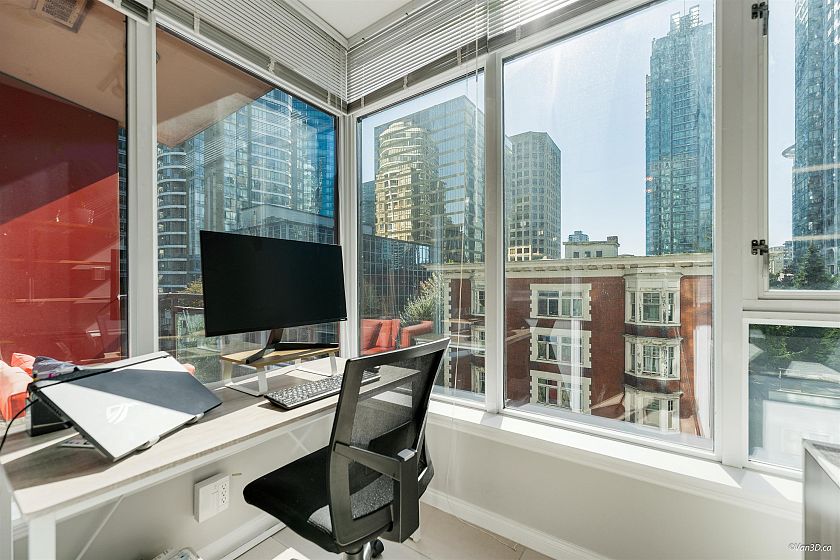 Welcome to The Ritz in Coal Harbour! SE-facing Corner 1 bed + den + solarium home is filled with natural light! Excellent floor plan with a spacious bedroom that fits a king-size bed. Functional den provides great in-suite storage, plus a sun filled solarium – perfect as a home office or flex space. Features include 9' ceilings, A/C for your daily comfort, kitchen with full size stainless steel appliances, gas cooktop, and granite countertops. Resort-style amenities: 24-hour concierge, indoor pool, hot tub, sauna, fitness centre, lounge, bike room & more. Unbeatable location – steps to the Seawall, Robson St, Burrard Station, restaurants & shopping. Includes 1 parking & 1 storage locker. Walk Score: 100. This one checks all the boxes!