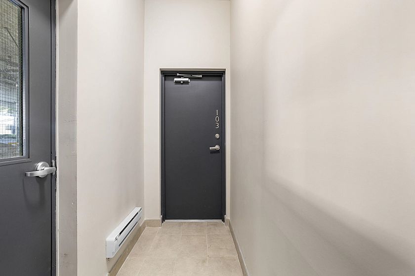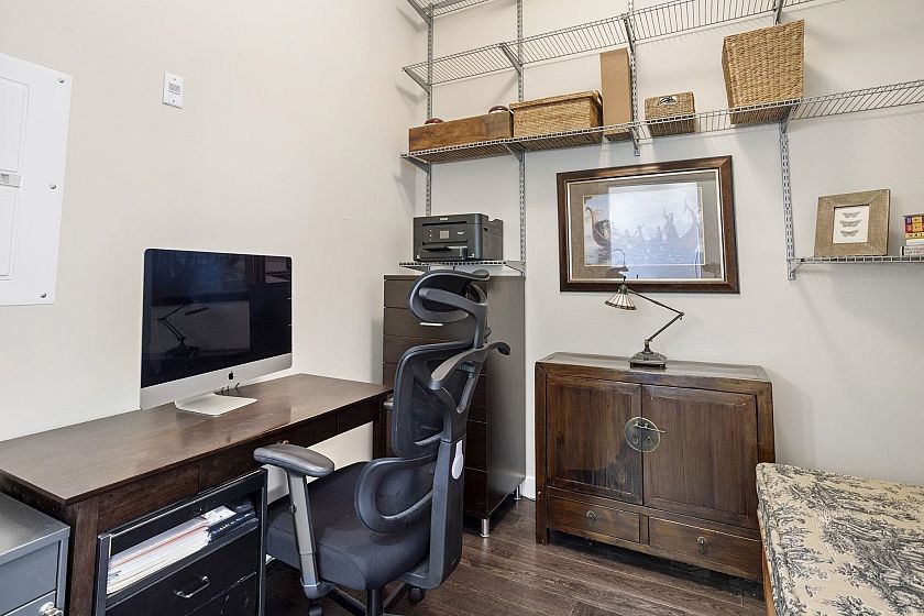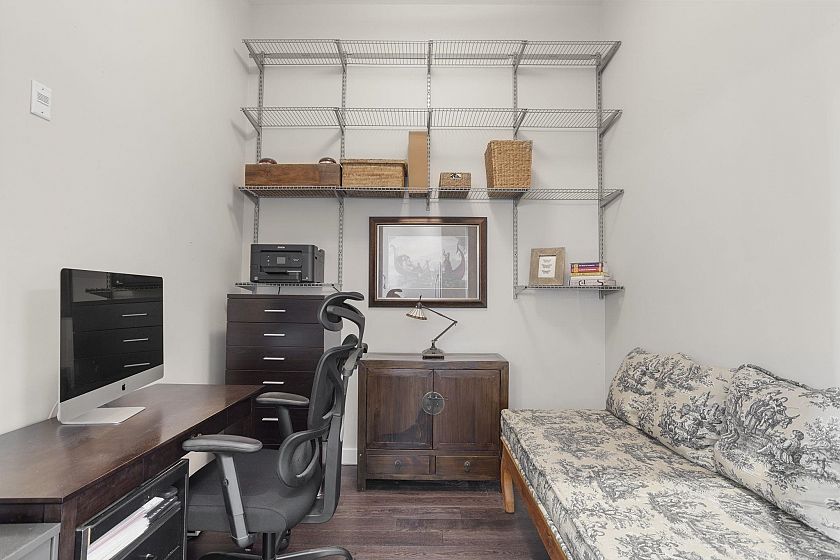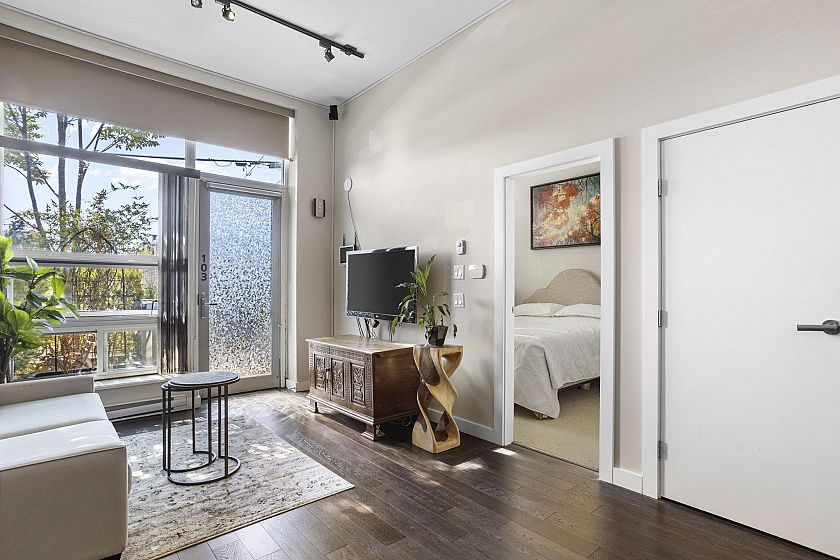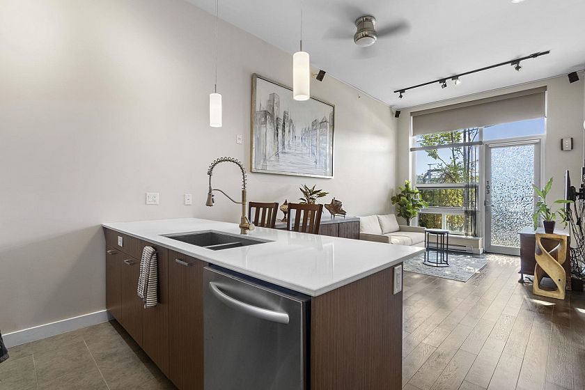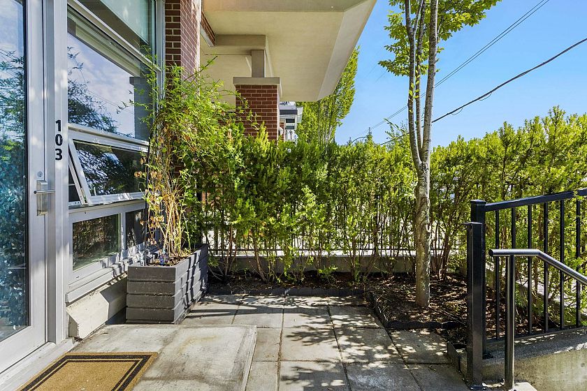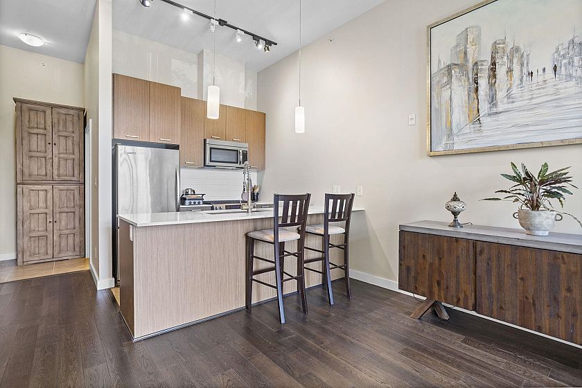 Spacious & beautifully designed 1 bed & Den+ bathroom home featuring a large, private patio—perfect for seamless indoor-outdoor living. Soaring ceilings and an open-concept layout create a bright, airy feel. This is 1 of 6 concrete-base units topped by 3 stories of wood-framed units. Full-size stainless steel appliances, quartz counters, custom flat-panel cabinetry with soft-close hardware, and wide-plank engineered oak hardwood flooring throughout. The bedroom has a large walk-in closet 2 parking stalls and storage. Quiet side of West 16th Street, just off Marine Drive, steps from shopping, dining, transit, & everyday conveniences. The Drive offers over 1,500 sq ft of premium amenities, a fully equipped fitness centre, resident lounge, & multi-purpose room.