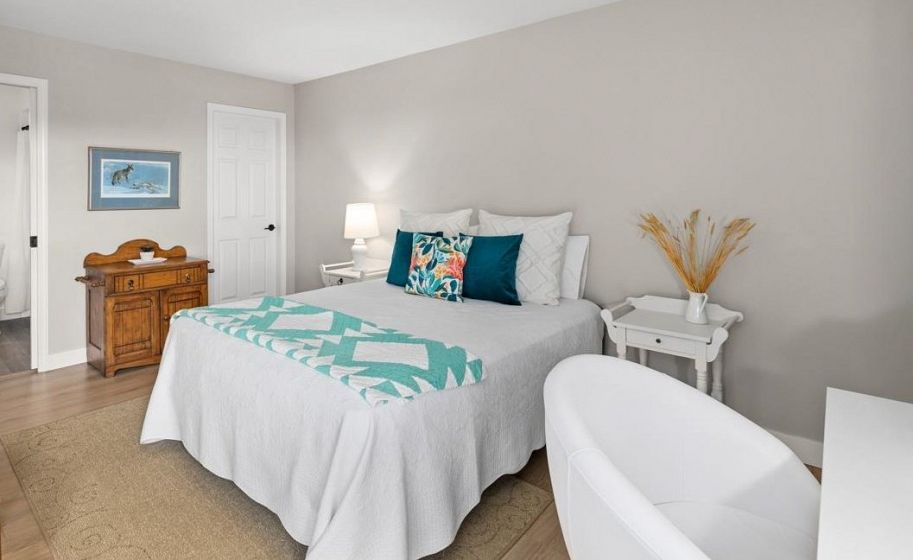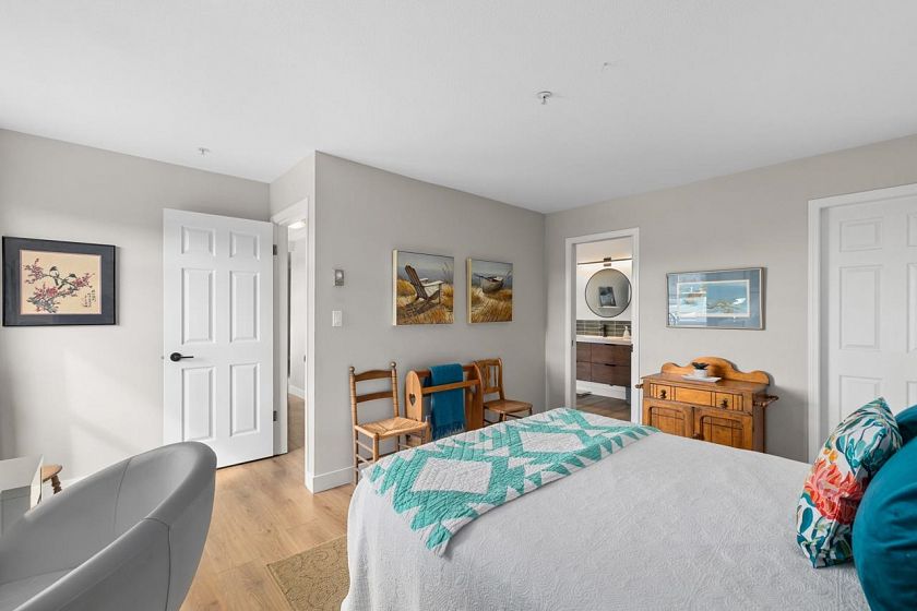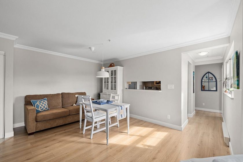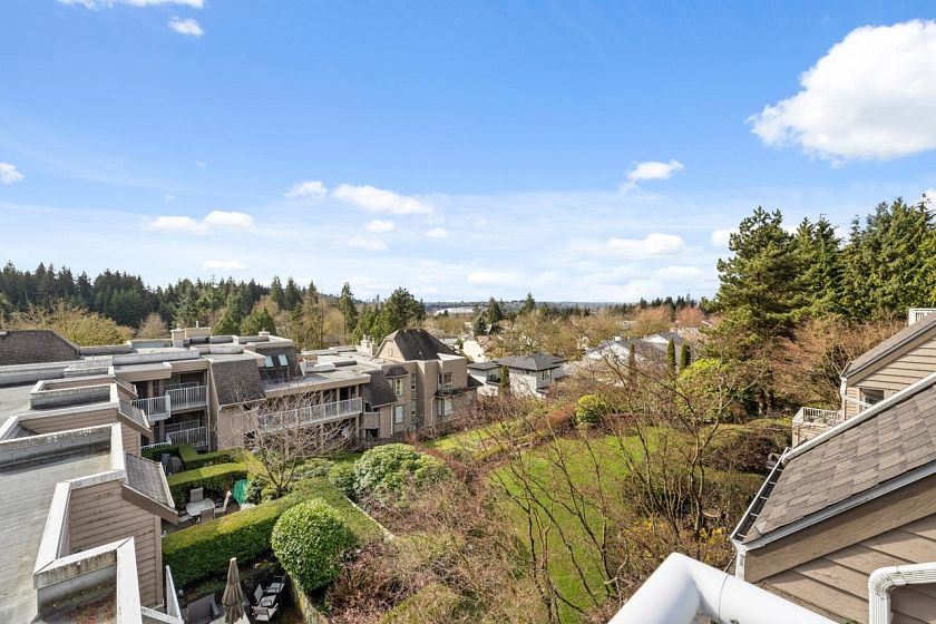 Downsizers Dream! Space, Privacy, Light, Views. This one-bedroom Penthouse is perched at the top of the building looking out over the tree-tops with south and southwest-facing views. The space is light-infused with the flexibility to open up the kitchen or to add a den. Exterior walkways are great for those with pets or bikes. Generous rooms across 1016 SF make this a unique find. Topped off with crown moldings, laminate floors & 2023 bathroom reno, this quiet, well-run, and friendly building is steps to shopping at Parkgate Village. It is an outdoor enthusiasts dream location: shopping, hiking, biking, boating, swimming, tennis, pickleball, community gardens and more all within minutes of your front door. 2 parking-one w/EV charger already installed! Bike room too.