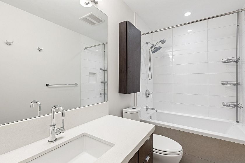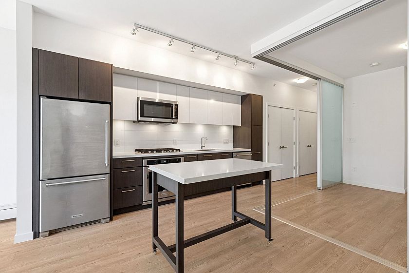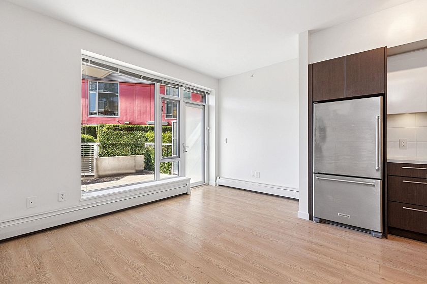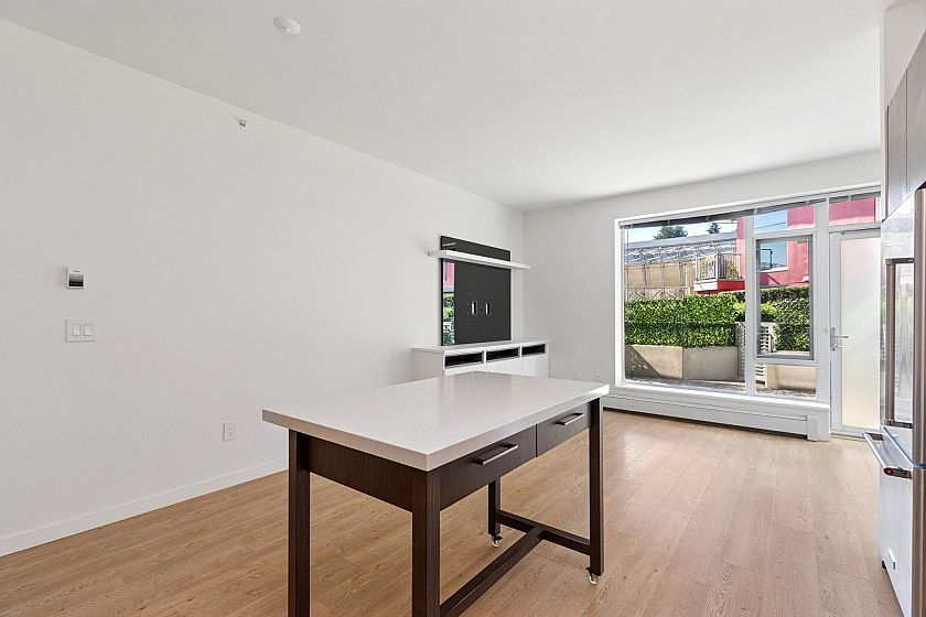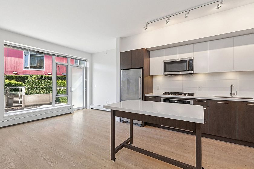 SUNNY GARDEN TERRACE HOME AT CANVAS. This contemporary 1 bedroom home is super functional and charming. Appreciate a chef's kitchen with full sized, stainless steel appliances including gas cooktop, over-height cabinetry and stone counters, flowing on durable laminate flooring into the dining area w/ movable island and living room w/ built-in media centre leading onto the sunny 182SF terrace with private entry/gas hook-up. This urban home features 9' ceilings and spacious bathroom with oversized vanity, deep soaker tub and in-floor radiant heating. Extensive amenities include fitness centre, lounge, garden and workshop. Includes 1 parking & 1 storage locker. Steps to Mount Pleasant's best restaurants, breweries, Seawall and new SkyTrain at Email Carr. *OPEN HOUSE SEPT 28, SUN 2-4PM*