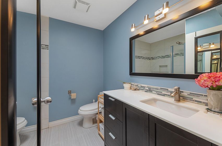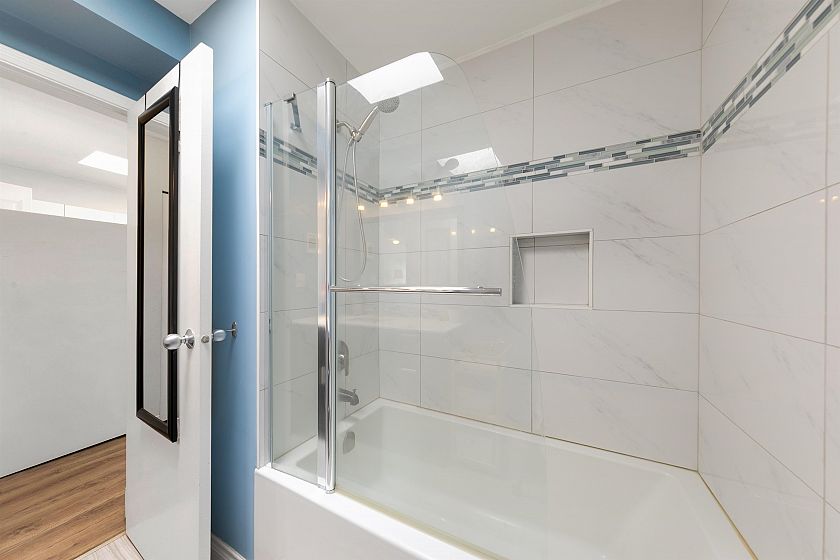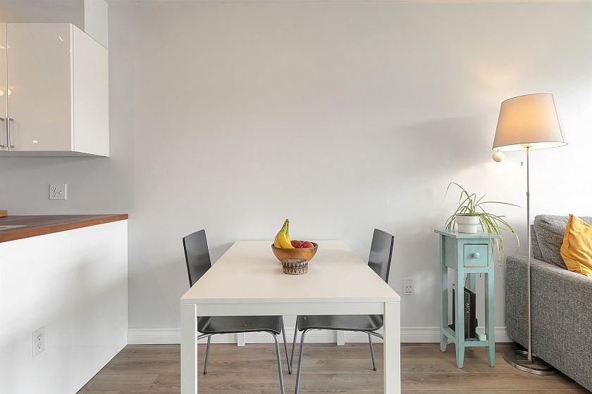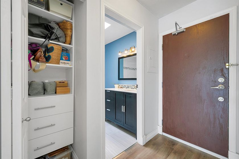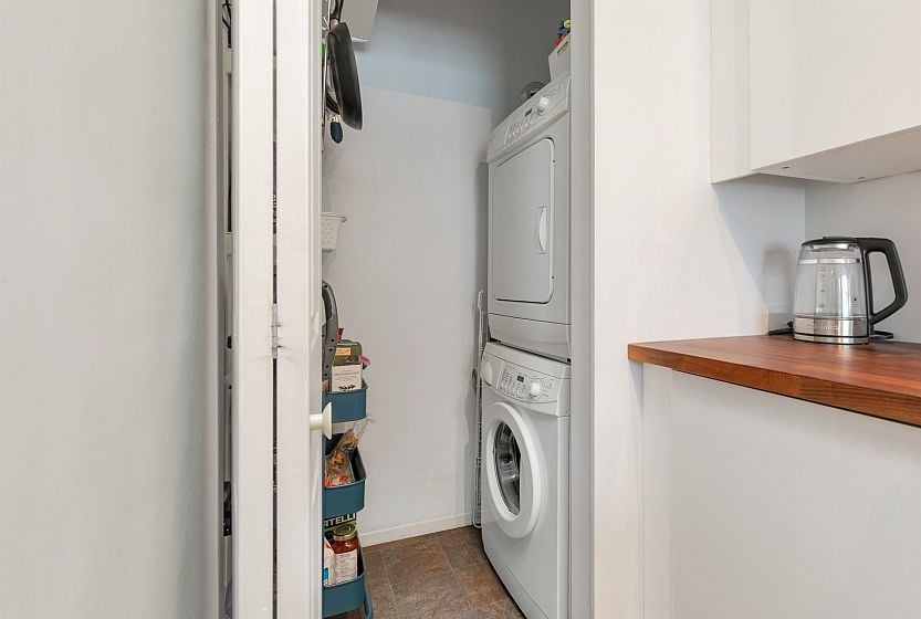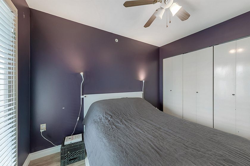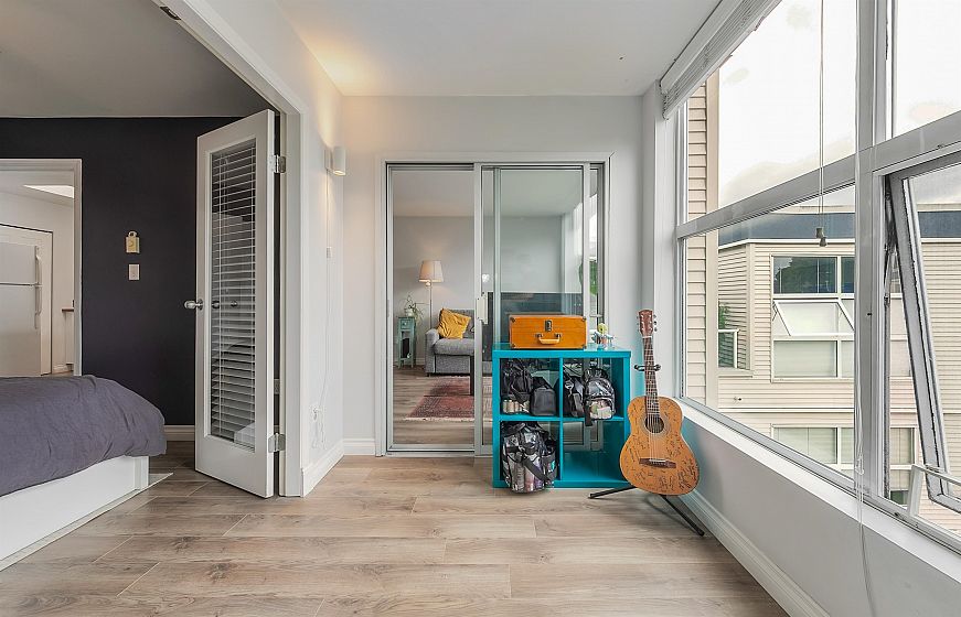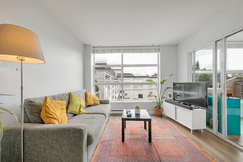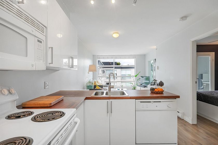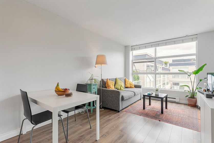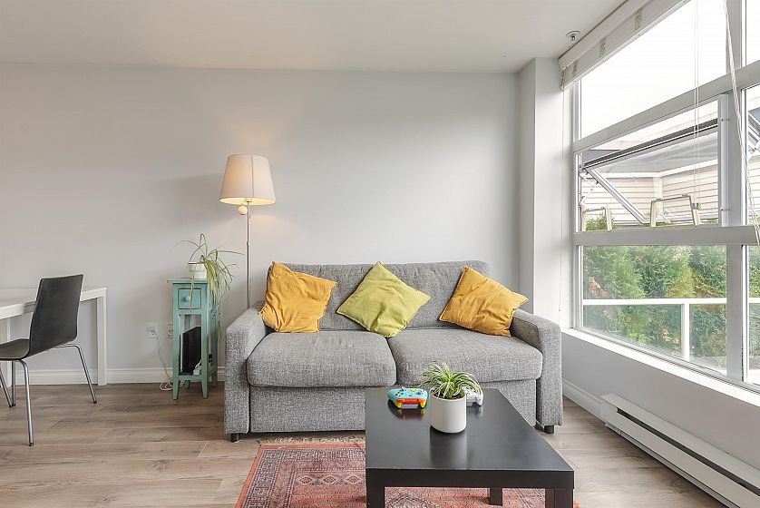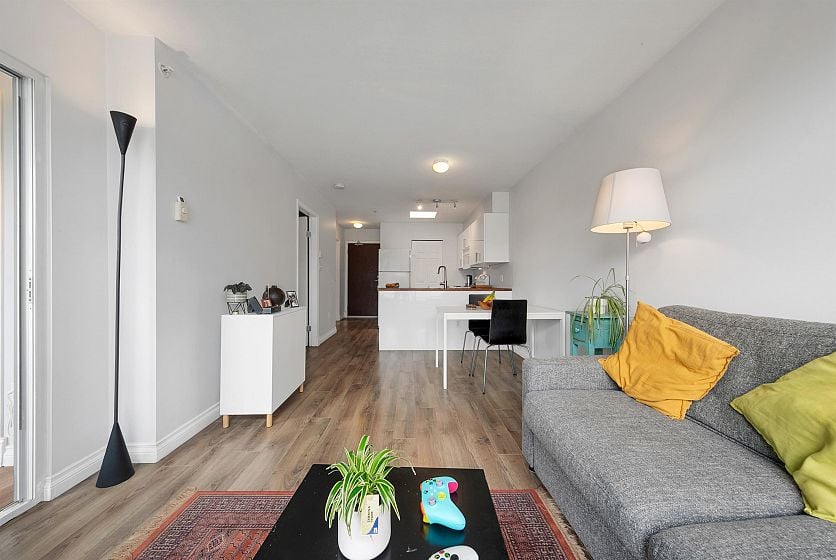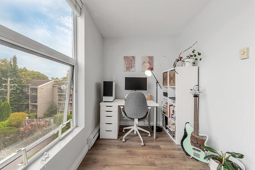 TOP FLOOR, QUIET COURTYARD EXPOSURE, 1 BEDROOM + DEN in this well maintained building and suite that shows pride in ownership. Starting with location you are less than a block from everything! Transit outside the front door, grocery stores, boutiques and restaurants. Soon to be a block from the newest skytrain station servicing Broadway. East facing, bright top floor overlooking the lush courtyard below from your open plan living area and large window-filled den space, perfect home office or flex (11 x 7). Very functional kitchen with ample cupboard and counter space. In suite laundry and pantry area. Updated bathroom with soaker tub and skylights to fill the space with light. HUGE parking stall and exterior storage locker with the unit. A pleasure to show!