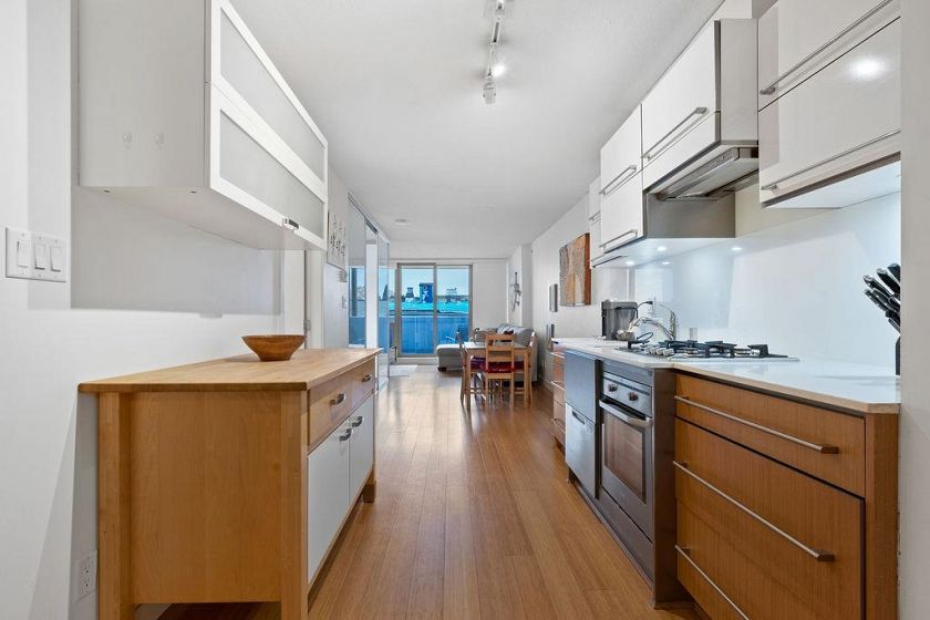 Welcome to this BEAUTIFUL corner Unit at Ginger. This RARE oversized 1 Bedroom & Den, 1 Bath apartment comes with A/C, and sits on the quiet side of the building! The Den could EASILY be a second bedroom and is huge! Exceptionally well maintained at 780 SqFt, this unit boasts a wide open floorplan, perfect for functional living and entertainment. Many upgrades throughout including the washer/dryer, dishwasher, oven, stove top, blackout blinds and more. Large Primary Bedroom fits a king size bed with space left over. The building is AIR BNB ALLOWED, comes with 1 parking & 1 Storage in the heart of Downtown Vancouver. Close to Transit/Skytrain, coffee shops, plenty of restaurants, speak easy bars, recreation, grocery stores. OPEN HOUSE SAT (NOV 8th) 2-3PM