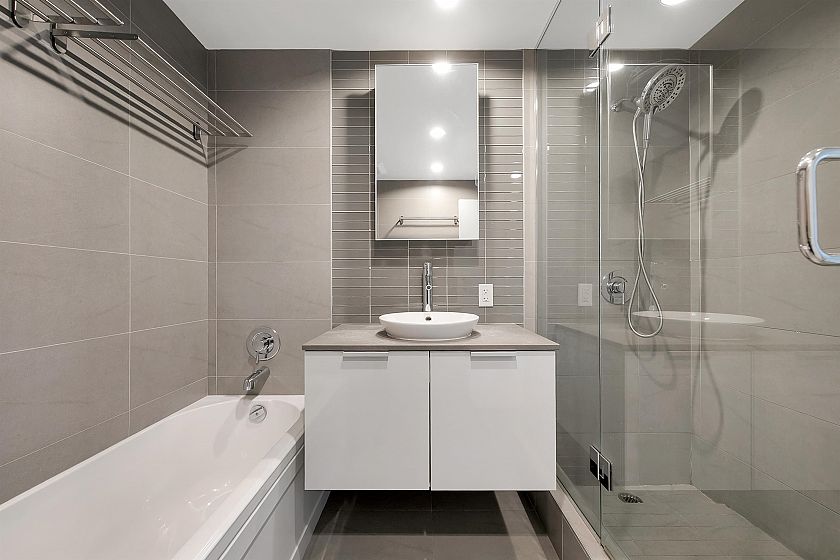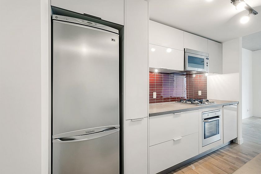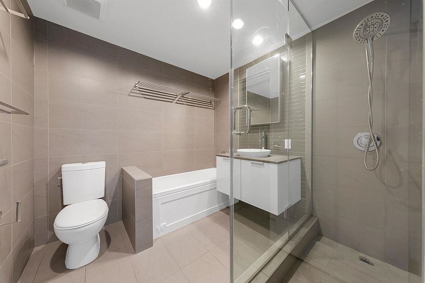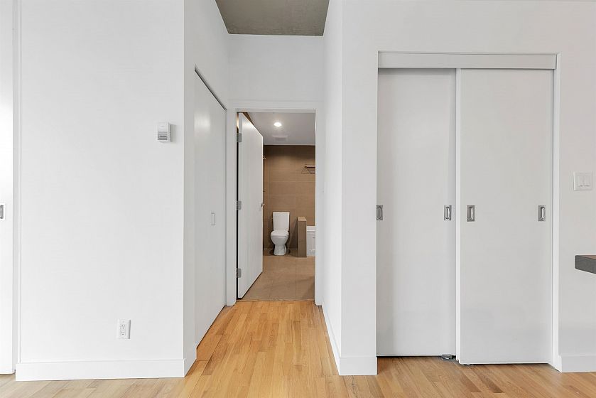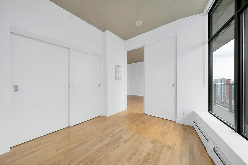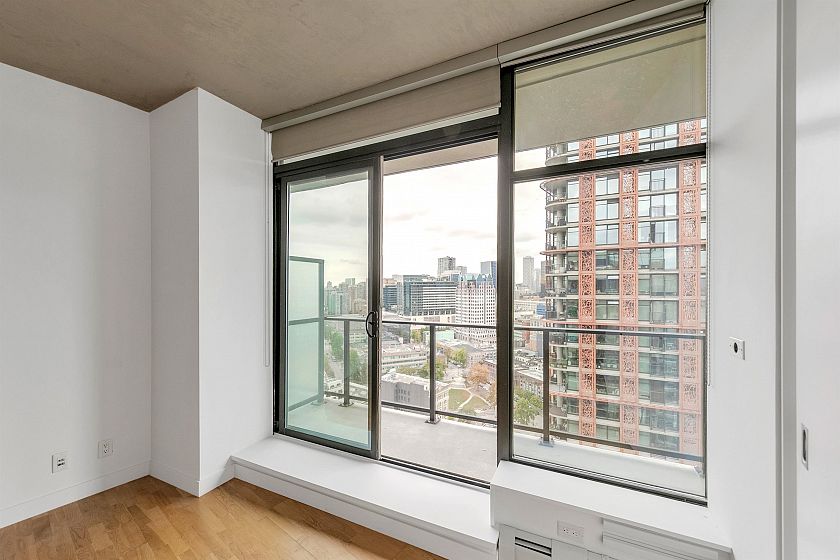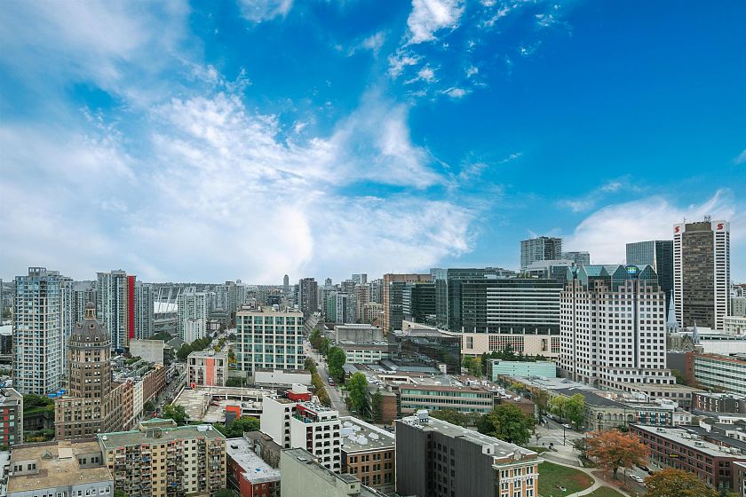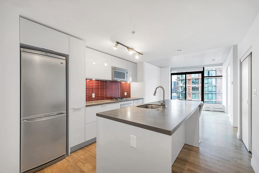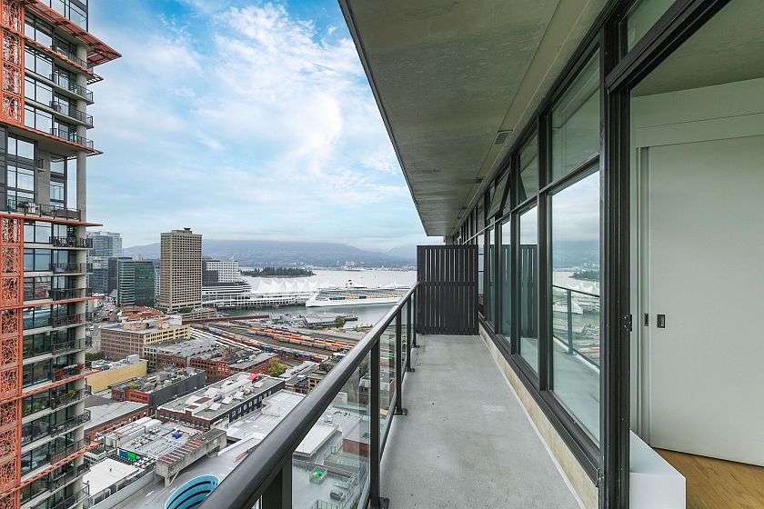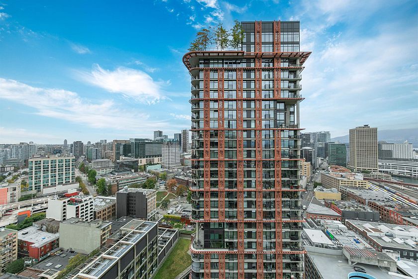 TOP FLOOR of the historic Woodwards! Sweeping views of City skyline, Ocean and North Shore mountains to enjoy from your patio that extends the length of the suite. Freshly painted and ready for a new owner, this urban condo offers over height polished concrete ceilings, giant floor to ceiling windows in the living and bedroom, h/w flooring throughout and enviable counter space that include a large quartz topped island. Large bathroom with separate shower and soaker tub, insuite laundry and California closets in the bedroom. Woodwards is famous for it's amenities and W shaped rooftop hot tub. Top of the line fitness centre, party room and working stations in a common area for work from home folks who like a change of scenery. Pleasure and EASY TO SHOW!