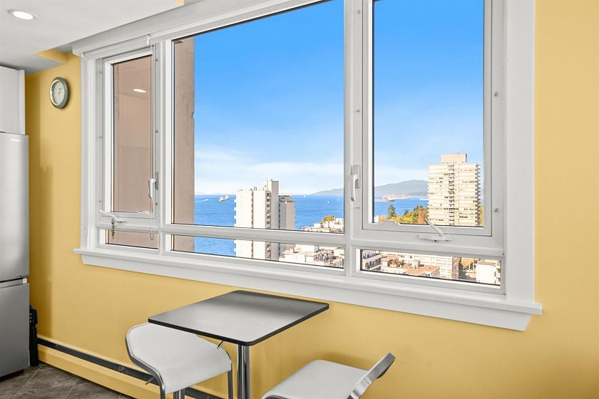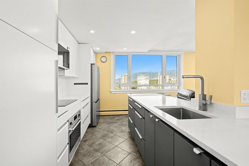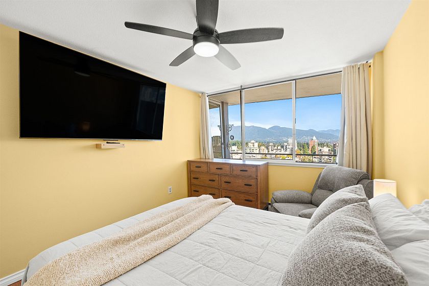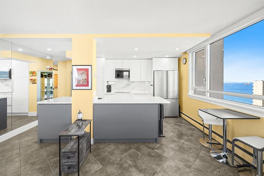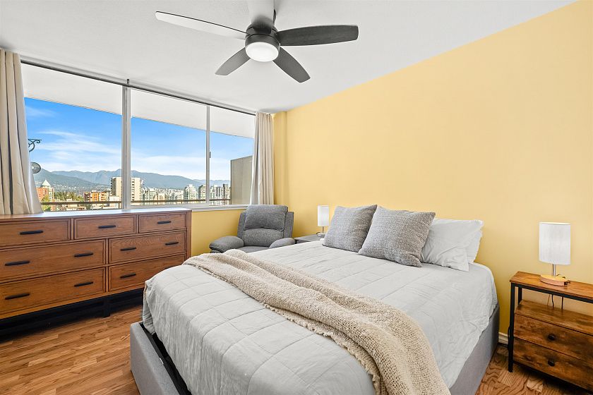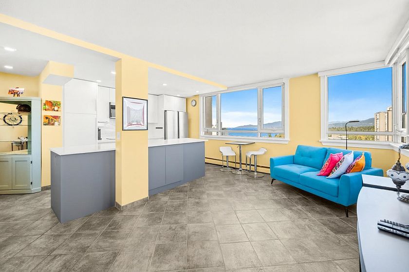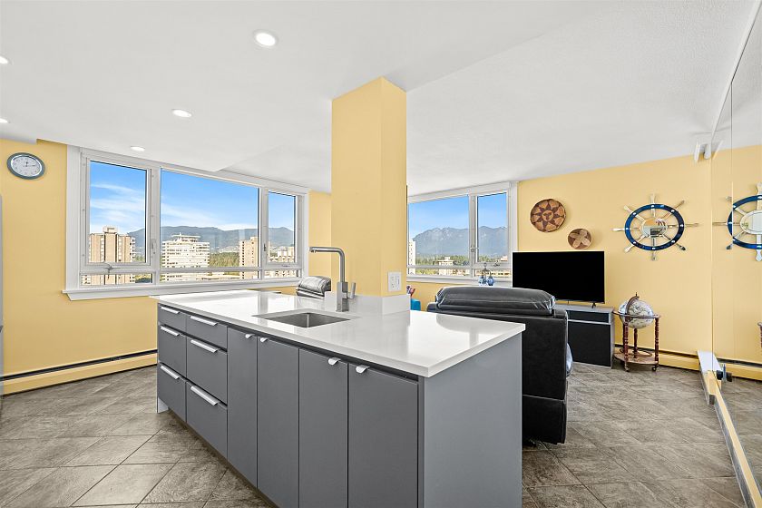 West of Denman! Bright 20th-floor corner suite with unobstructed ocean, mountain & city views from every window. NW exposure fills the home with natural light, ocean breezes & year-round sunsets. Extensive updates include a sleek high-gloss kitchen with quartz counters, new induction oven & S/S appliances. Be part of the unparalleled West End community, with beach, Stanley Park, pools, local shops & global eats on Denman Street at your doorstep. Well-managed concrete building with major upgrades complete, including roof, plumbing, pool & lobby, plus a rooftop lounge with 360° views. No Empty Homes Tax. Maint. fee includes taxes, heat, hot water & amenities. Lease prepaid to Dec 31, 2073.