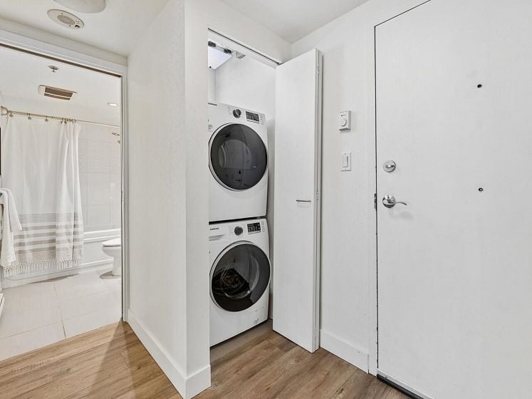 SMART by CONCORD PACIFIC - Spacious, open concept GASTOWN one bedroom condo with in suite laundry and parking at a great price! A short stroll to The Pan Pacific, Waterfront Skytrain, and many of the best restaurants and tourist spots in Vancouver. With high gloss white cabinetry, rich laminate flooring, floor to ceiling windows, juliet balcony, office nook, and contemporary finishings throughout, this home is a great choice for a first time buyer or investor. Worry free building with gym, storage, and secure underground parking. Pets and rentals allowed. Showings by appointment only. Open House Saturday, October 11th from 2-4pm.