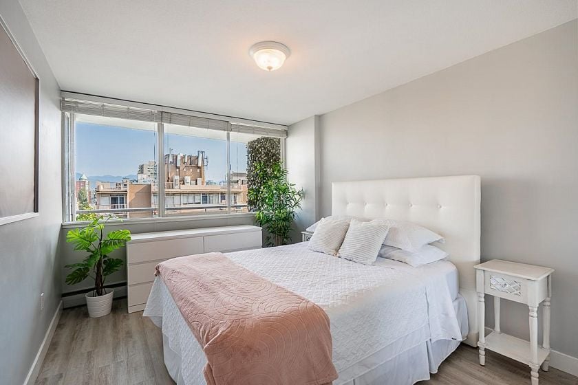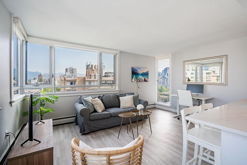 HIDDEN GEM: Fully furnished, beautiful, bright, spacious 1BR on 12th floor. West of Denman w/ gorgeous views to English Bay, Stanley Pk & mountains. FULLY RENOVATED. READY TO MOVE IN! Large windows; tons of natural light. Stunning comprehensive reno w/ SS stove, fridge & micro; quartz counters; shaker-style wood cabinets; vinyl-plank floors. 612 sqft interior + 60 sqft deck; one of El Cid's largest units. Secure covered parking. Large storage locker. Heated indoor pool, sauna, well-equipped fitness rm, bike rm, shared laundry. Penthouse rec centre & deck with 360 views, perfect for fireworks. On-site caretaker. Superb location: 1min walk to Denman shops, restaurants & transit; 2 blocks to Stanley Pk, English Bay & seawall. Excellent rental. Financing available from VanCity Credit Union.