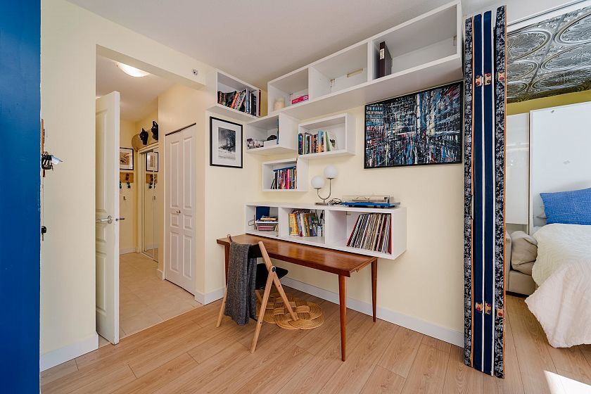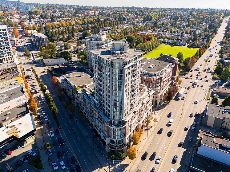 TRANQUIL Yet EVERYTHING AT YOUR DOOR! Groceries, transit, bright and modern junior one-bedroom condo w/flex room, positioned on the quiet side of the building overlooking the PEACEFUL COURTYARD. Designed for both comfort and function, this home features a smart floor plan with 9-foot ceilings, oversized windows, and elegant Winter Oak laminate flooring. The sleek kitchen boasts granite countertops, stainless steel appliances, and eat in space. Other features include a versatile flex room, IN-SUITE LAUNDRY and BALCONY. 1 PARKING underground, 1 STORAGE LOCKER. gym. Located in a vibrant & walkable neighborhood just steps to transit, Trout Lake, library, groceries, great mix of cafes. Murphy bed can be removed. High style, low maintenance, ready to move in! OPENHOUSE: Sun. Dec 14, 11:30 to 1pm
