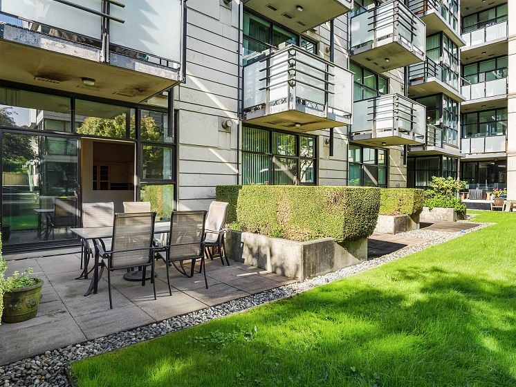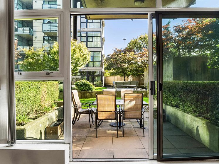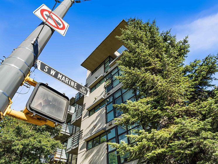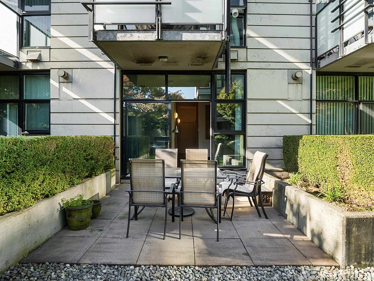 ATTN PET LOVERS! This super pet-friendly building allows up to three small dogs or two large dogs or three cats. The open concept features a half wall between the living area and the bedroom area which, combined with the high ceilings, creates an expansive feel. The living area has a freestanding gas fireplace with sliding doors to a 131 sq. ft. patio situated in the secure inner courtyard of the complex. The kitchen has space for a dining table, lots of cabinet space, stainless steel appliances and gas range. The unit features a walk-in closet, a small den/storage area, plus in-suite laundry. Building also has a large exercise room. Close to great shops in Marpole and Cambie Skytrain. Parking / storage.