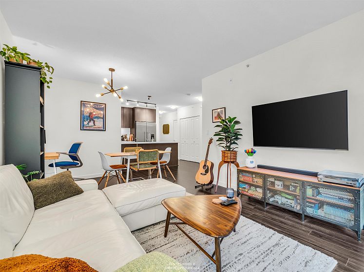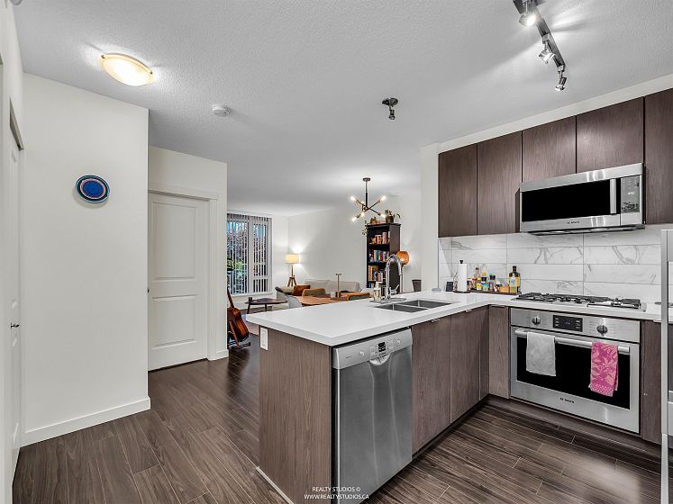 Prime River District 1 BEDROOM + DEN GROUND FLOOR concrete building by POLYGON with its own safe private covered WALK OUT PATIO (282sq ) for pets or young children. West Coast modern architecture featuring brick and concrete facades with a spacious, 9' ceiling and an open floor plan. Laminate floors & Stainless steel appliances Up-to-date & fully equipped fitness room and huge party room. 1 parking space with a lot of visitor parking. Just mins driving to Metrotown, Richmond and Marine gateway. Walking distance to the Fraser River trails, parks, Save On Foods, Shoppers Drug Mart, and Romer's Burger Bar. Clean and well-maintained unit in move-in condition. A MUST SEE AND QUICK POSSESSION POSSIBLE.