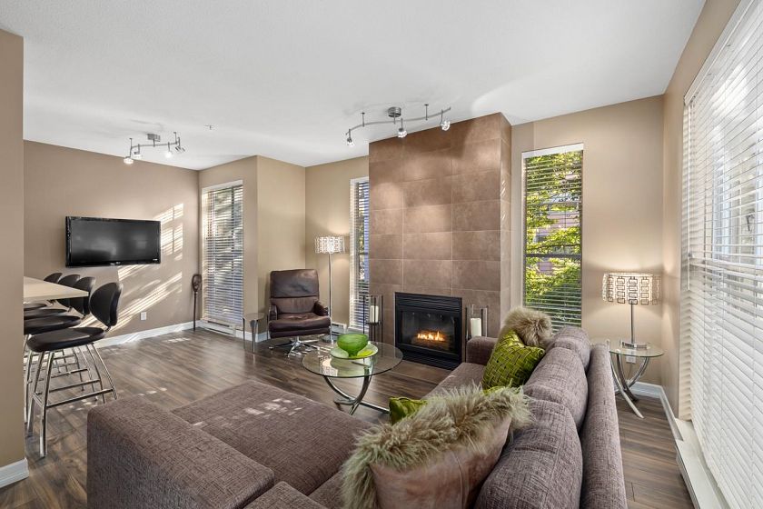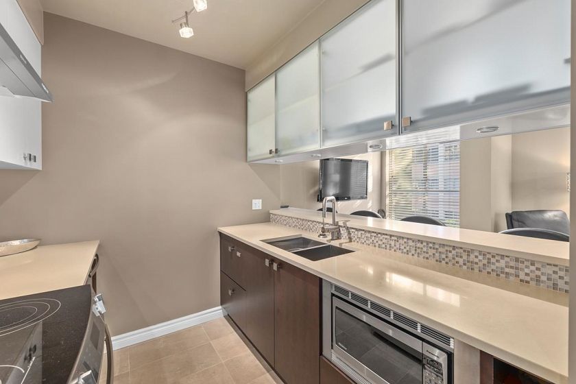 WESTPARK HOUSE, West of Denman. Wonderful spacious, corner home with south & east windows, High 9' ceilings. Large balcony w/ lovely leafy private outlook. Airy open living & dining areas, gas fireplace, designer renovated kitchen with quartz counters, custom modern flat panel cabinetry, Jennaire stainless steel appliances, integrated dual dishwashers. Gorgeous bathroom with oversized tiles, frameless glass shower with overhead rain & wall spray handle. Immaculate, lightly lived in "like new" condition. Parking & locker included. 3 pets OK (2 dogs/cats). Excellent rain-screened, freehold strata. Extraordinarily peaceful location, steps to English Bay, Seawall, Stanley Park, shops, cafes, restaurants, transit on Denman. Easy to view. Homes like this & the prime tranquil location are rare!