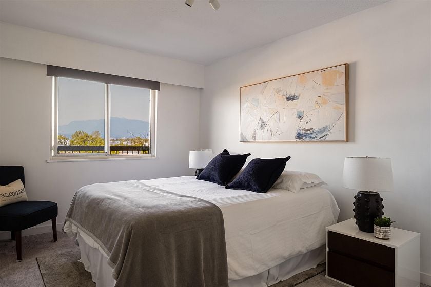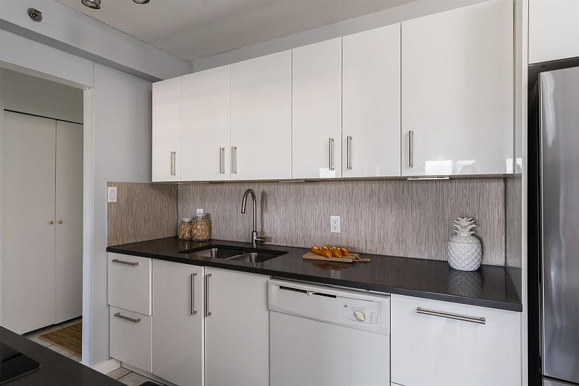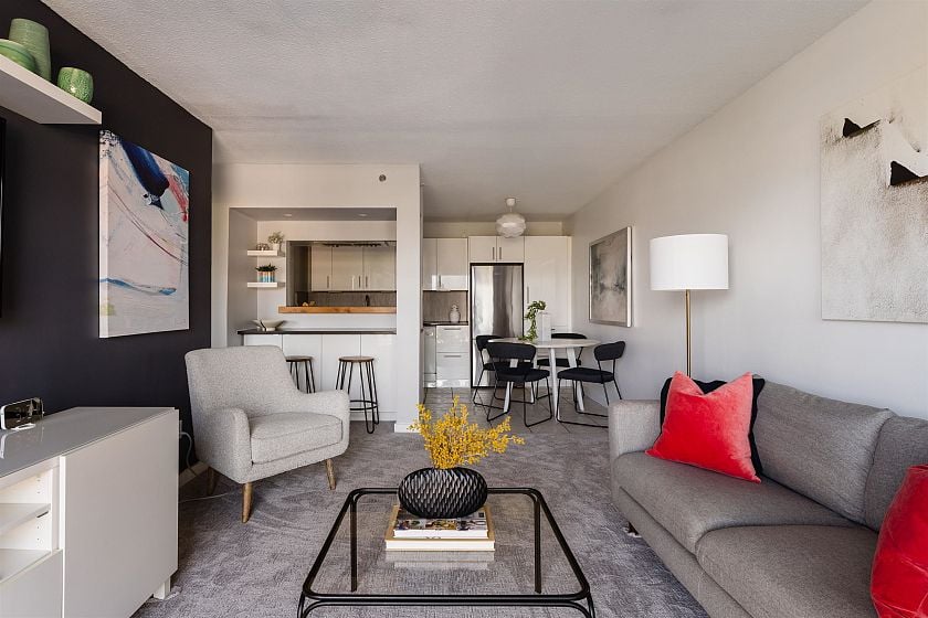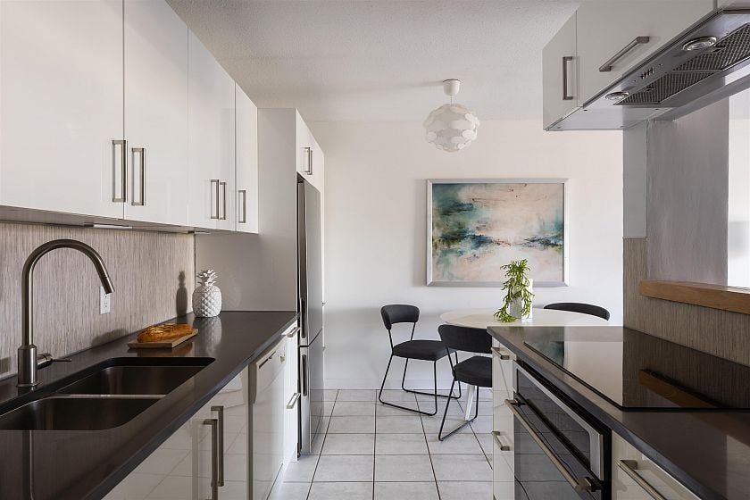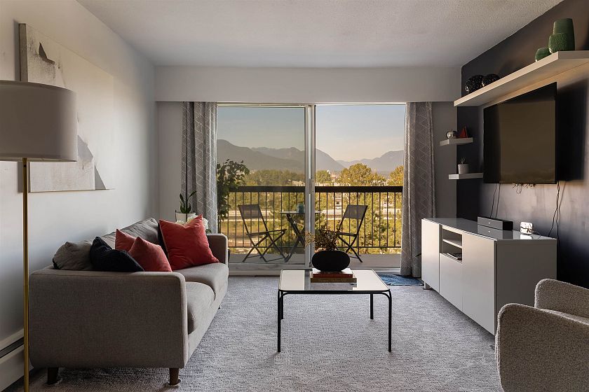 Welcome to Pacific Terraces, a bright 1bed, 1bath, 612SF home w/ beautiful NorthShoreMountain views. Fully reno'd kitchen 2018: cabinetry, counters, backsplash, doublesink+faucet, appliances, & opened walls. New carpet w/ a fresh paint in 2025. Proactive strata approved upcoming exterior renewal: roofs, decks&railings, insulation, rainscreen, cladding, + windows. ~$44,000 levy fully paid by the seller. Previous upgrades: repiping, resurfaced parkade, & seismic work. Amenities: updated gym, sauna, + carwash. Shared laundry directly outside unit + large shared laundry room on 1st floor. Steps to EmilyCarrUniversity, NemesisCafe, & future GreatNorthernWay-EmilyCarrSkyTrain w/ new shops, restaurants, & a grocery planned for the area. 1parking+1storage. Open houses every Sunday, 10am-12pm