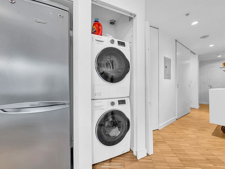 Live in the ICONIC WOODWARD'S Building! Here it is - your chance to own in one of Vancouver's most recognizable landmark buildings. This stylish and modern 1-bedroom + oversized den (with closet!) offers an open, light-filled layout overlooking a peaceful courtyard. The contemporary kitchen features stone countertops, gas range, and in-suite laundry, while exposed concrete ceilings and gallery-style walls give the space a cool, urban edge. Your strata fees include internet, heat, hot water, and gas, making this home as practical as it is beautiful. Enjoy incredible city and mountain views from the rooftop indoor/outdoor lounge and deck - complete with a state-of-the-art gym, outdoor hot tub, and 24/7 concierge. Just a 7-minute walk to Waterfront Station. Open house Sunday October 26 2-4pm!