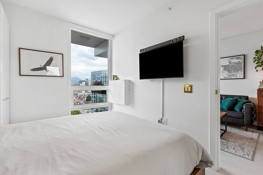 Super functional and bright 1 bed & den in a nearly new air-conditioned boutique building in Mount Pleasant/Olympic Village with city and mountain views! The sleek kitchen is equipped with integrated Liebherr/Porter&Charles appliances, stone counters and plenty of storage space, flowing on durable laminate flooring into the living room & covered balcony. The spacious bedroom features custom built-ins & large window inviting exciting city lights. This meticulously maintained home features roller blinds and many thoughtful upgrades throughout. Building amenities include a fitness centre, party room and rooftop deck w/ BBQ, dining areas, lounges & garden plots. Steps to SkyTrain, breweries, SeaWall, community centre, shopping, cafes & Emily Carr.
