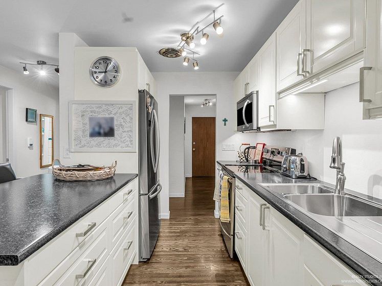 This very well maintained Co-Op building "Maddock Manor" is an ideal home to settle into in the heart of Kerrisdale. A spacious 768 sq ft easy access ground floor unit has been beautifully renovated in 2015, featuring a modern kitchen, updated bathroom, new flooring, lighting, large expansive windows, and an electric fire place with custom shelving all around. Residents must be 30+. No rentals allowed except cats allowed. Waitlist parking, but has ample street parking. One storage locker and the building has FREE shared laundry plus FREE heat and hot water inclusive in the maintenance fee of $303.00 pm!! Enjoy a walkable lifestyle just steps to shops, cafés, restaurants, Kerrisdale Community Centre & Library, Arbutus Greenway, parks, tennis courts and excellent transit options. O/H Sun 2-4