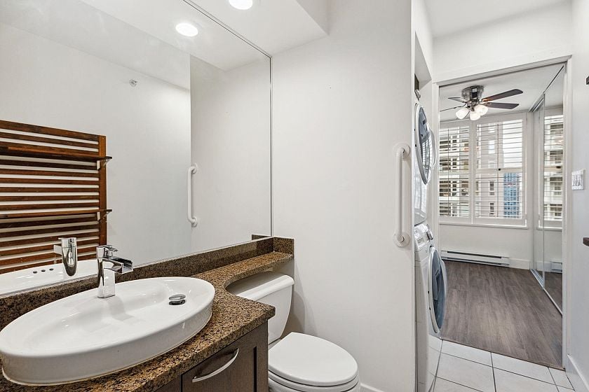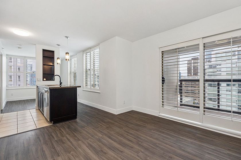 Welcome to this spacious and bright upper floor 1 bedroom + den corner home in the Mondrian 1 by Bosa, perfectly located at the edge of Yaletown. With a unique floor plan offering flexibility and plenty of space, this home is flooded with natural light and features stylish wood shutters, stainless steel appliances, granite countertops, and laminate and tile throughout. Enjoy cozy evenings by the gas fireplace or unwind on your balcony with stunning city views. The building offers resort-style amenities including an exercise centre, hot tub, sauna, guest suite, and visitor parking. Plus, you’ll have 1 parking spot and a locker for added convenience. Steps away from Yaletown's trendy restaurants, retail, and transit, this home offers the perfect blend of comfort, style, and location.