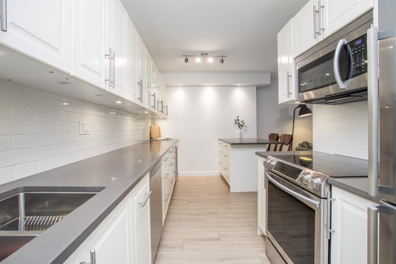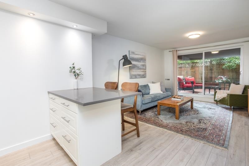 This fully updated ground-floor 1 bedroom home offers stylish living with unbeatable outdoor space. Completely renovated with updated flooring, sleek kitchen counter tops and cabinetry, stainless steel appliances, smooth ceilings, In-suite laundry, and pot lights throughout. The 405 sqft south-facing patio is a true outdoor oasis with its own private entrance—perfect for entertainment and pet friendly lifestyles. Bonus: Hot tubs and outdoor saunas are permitted with approval, giving you even more ways to make the space your own. Mount Pleasant manor is a well-maintained building with major updates including windows, roof, balconies and doors. Includes 1 parking stall, and 1 storage locker. 1 dog allowed (no size restrictions) and 1 cat.