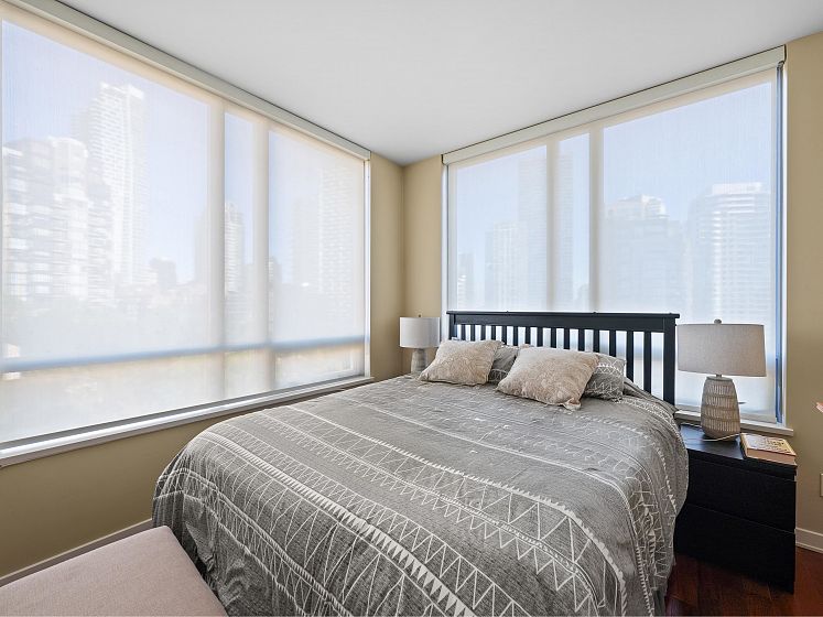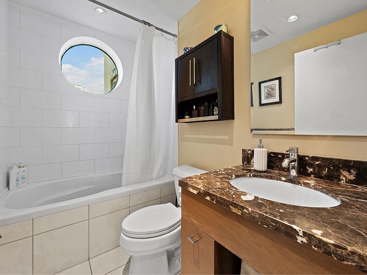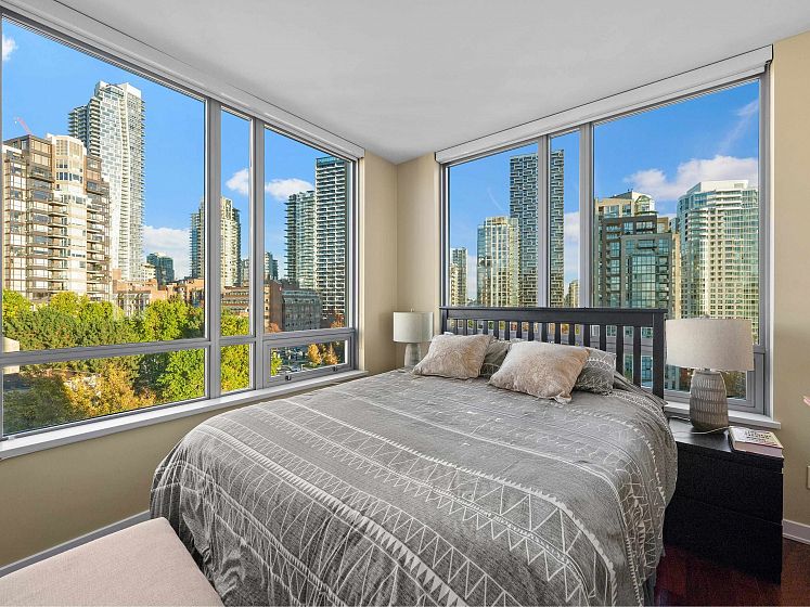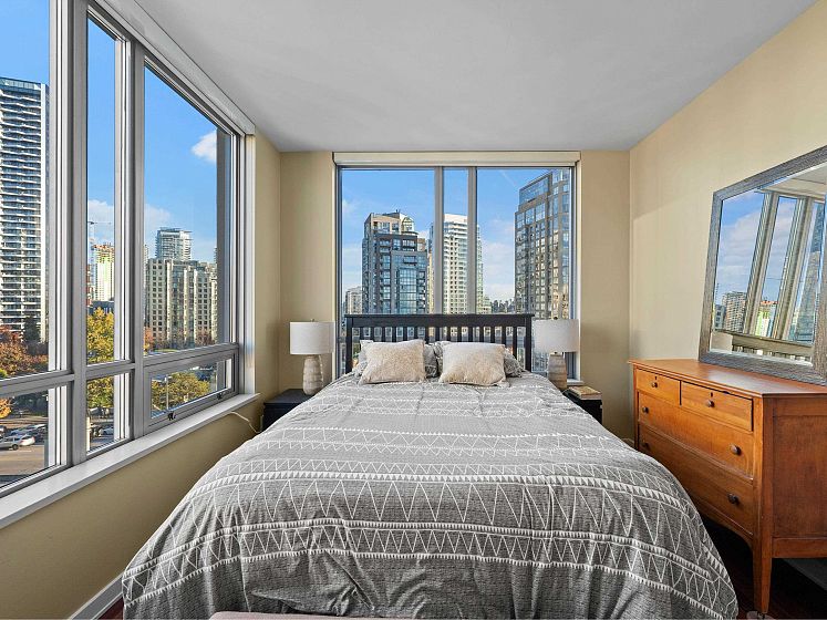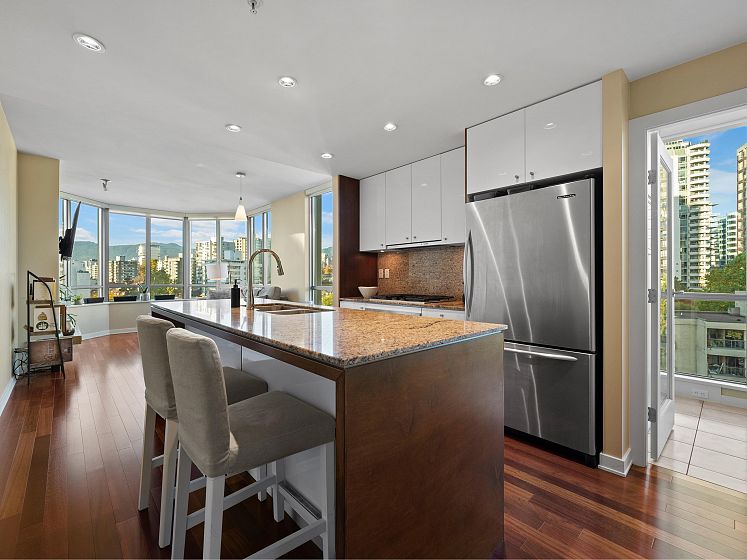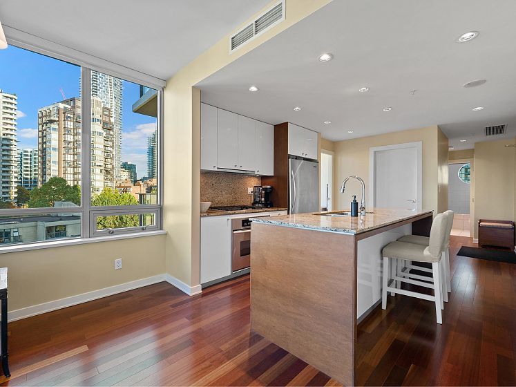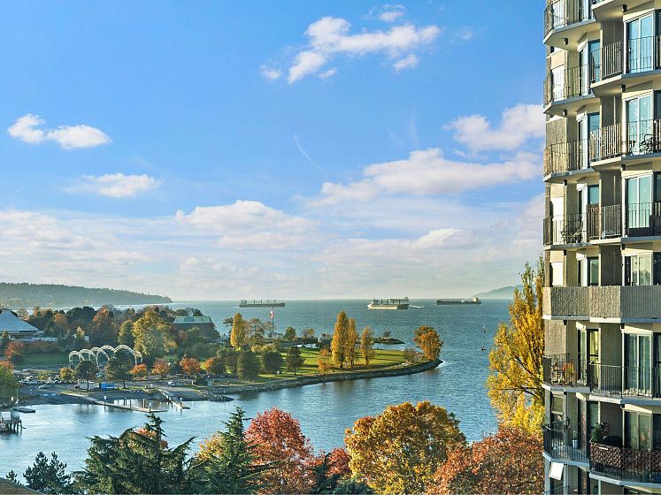 A rare offering in one of Vancouver’s most sought-after waterfront addresses. This exquisite residence at The Alvar exudes sophistication with its bright, open design, over-height ceilings, and expansive windows framing breathtaking city views. Enjoy your private balcony, perfect for morning coffee or evening sunsets. Impeccably finished with hardwood flooring, the gourmet kitchen is a showpiece featuring granite countertops, a generous island for casual dining. Central air conditioning ensures year-round comfort. Indulge in resort-style amenities including a jacuzzi, media and recreation lounges, pool table, conference facilities, and full security. Ideally positioned across from the Aquatic Centre, seawall, and minutes to Granville Island.
