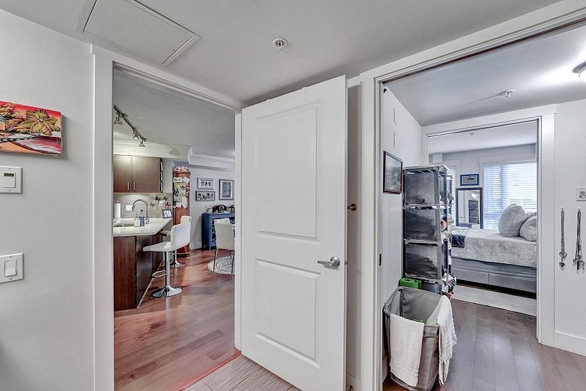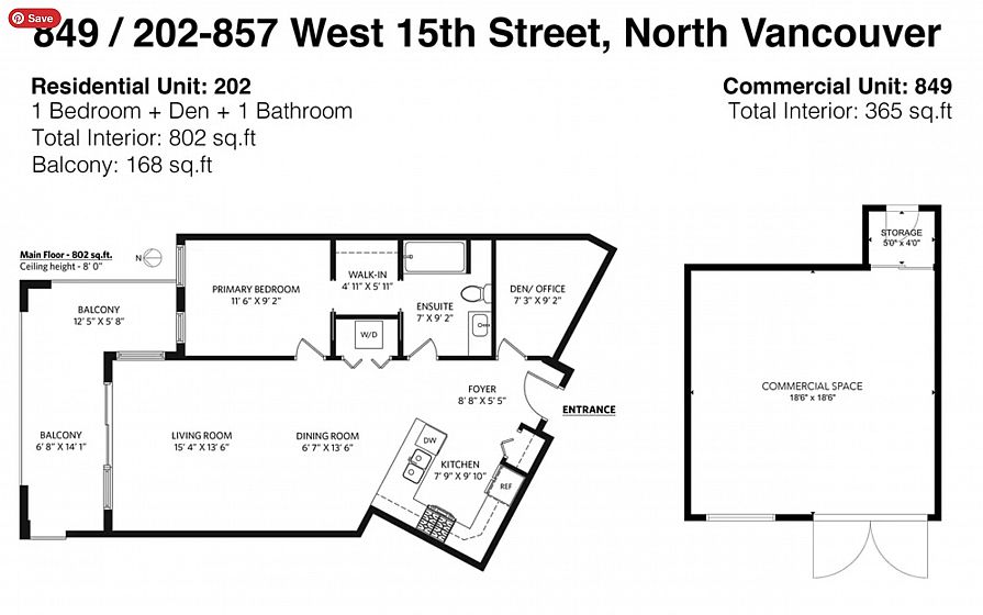 A UNIQUE OPPORTUNITY TO OWN BOTH A RESIDENTIAL UNIT AND COMMERCIAL UNIT, EACH INDEPENDENT FROM ANOTHER. On the ground level, you have a 365 square foot retail space, and on the 2nd floor you have a 802 square foot residential One bedroom plus Den. The Vue features attention to detail with premium engineered hardwood flooring throughout, enjoy a modern kitchen with full size stainless steel appliances, custom wood veneer cabinets, and a gas cooktop, plus a custom walk-in closet included in the bedroom. Capilano Mall and transit at your doorstep. HEAT & HOT WATER INCLUDED IN THE MAINTENANCE FEES! 1 parking, 1 storage, and extra parking stall is available for purchase. Currently rented for $4,666 per month.