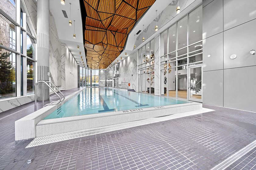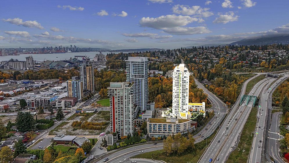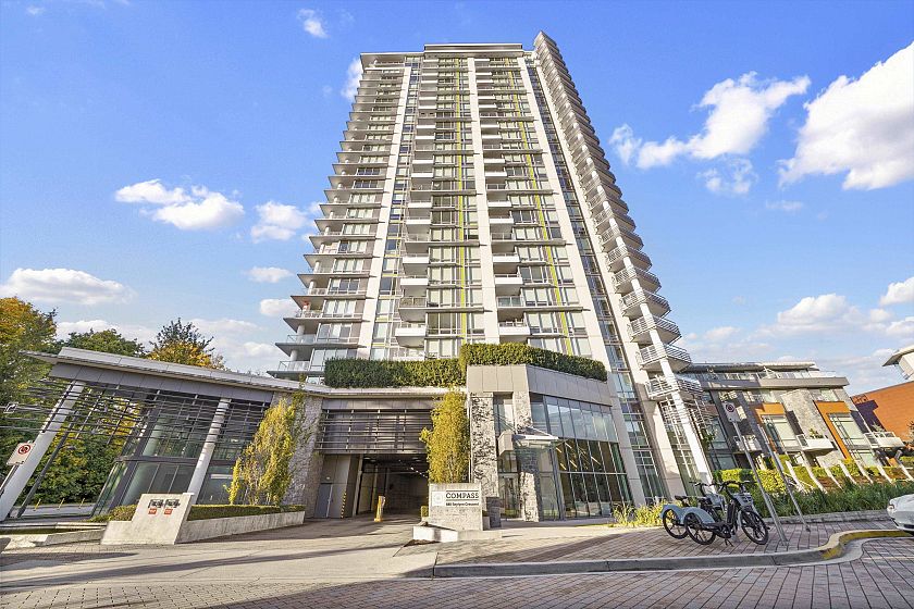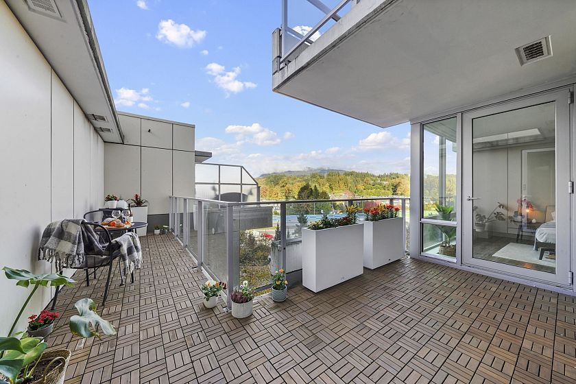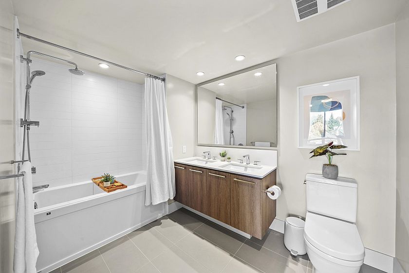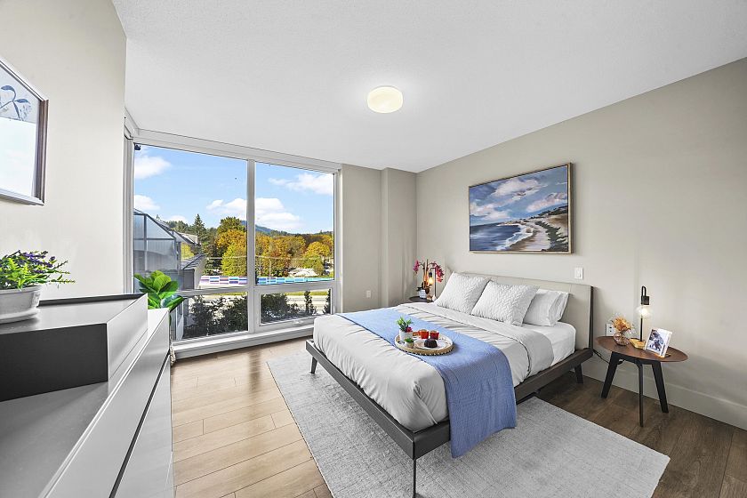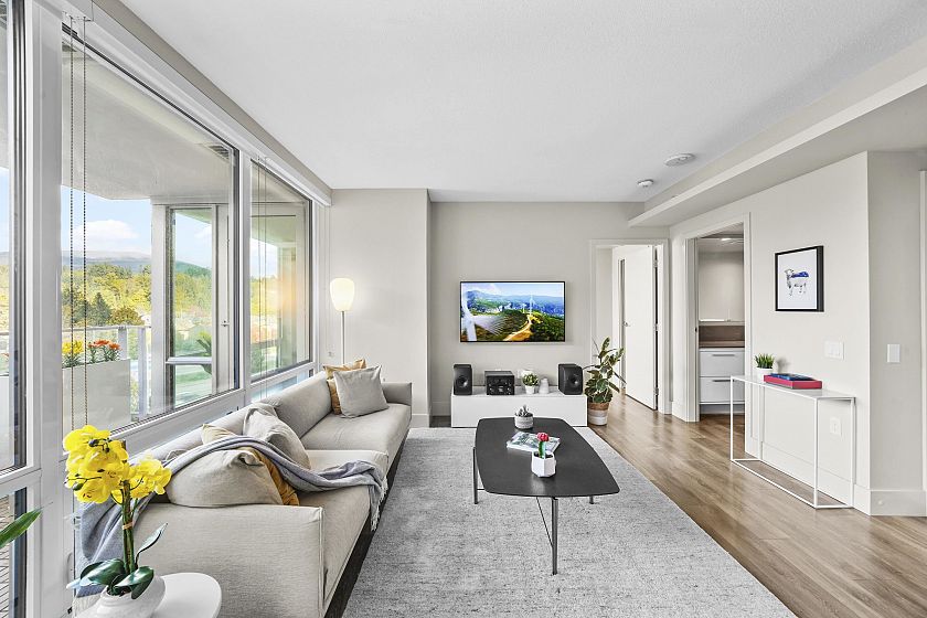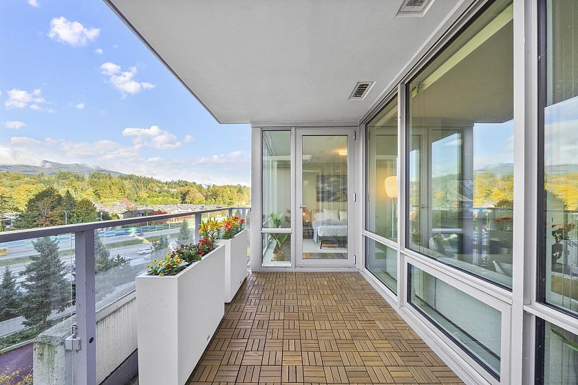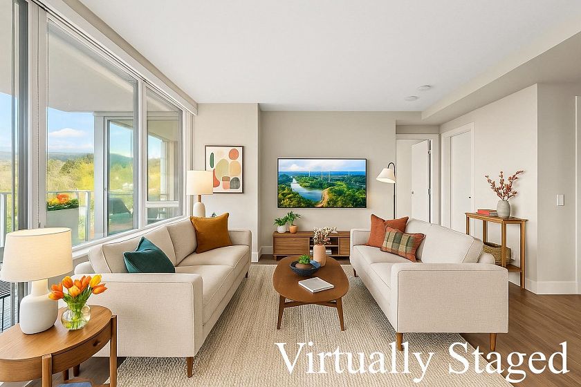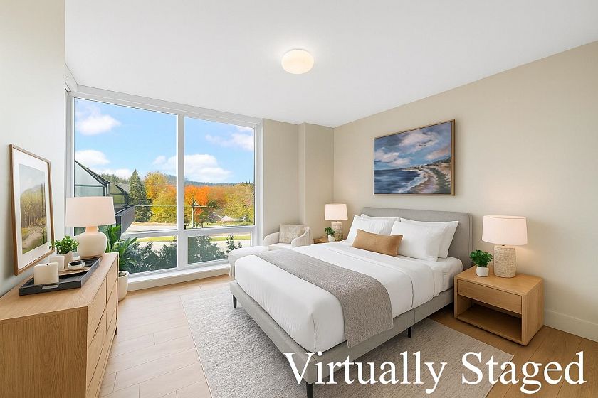 Resort-style living-rare North-facing home: where over-height ceilings & floor-to-ceiling triple pane windows showcase breathtaking mountain views! 1 of only 4 homes of this unique layout, features oversized rooms & expansive 220SF L-shaped balcony—the perfect place to enjoy the morning sunrise or unwind under the evening glow. Bright open-concept offers spacious primary bedrm w/ a walk-in closet & a spa-inspired ensuite complete w/ double sinks. Opposite side, a large den easily functions as a 2nd bedroom or home office, a powder room for guests. Chef’s kitchen w/ Bosch gas cooktop, Fisher&Paykel S/S refrigerator, modern backsplash, Quartz countertops & ample custom floor to ceiling cabinetry. A/C, private bike locker, wheelchair accessibility &more! Make this your own NorthShore retreat!