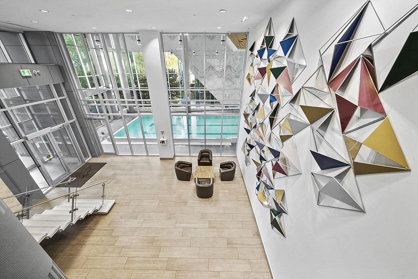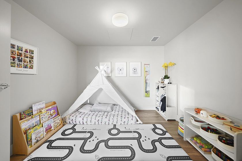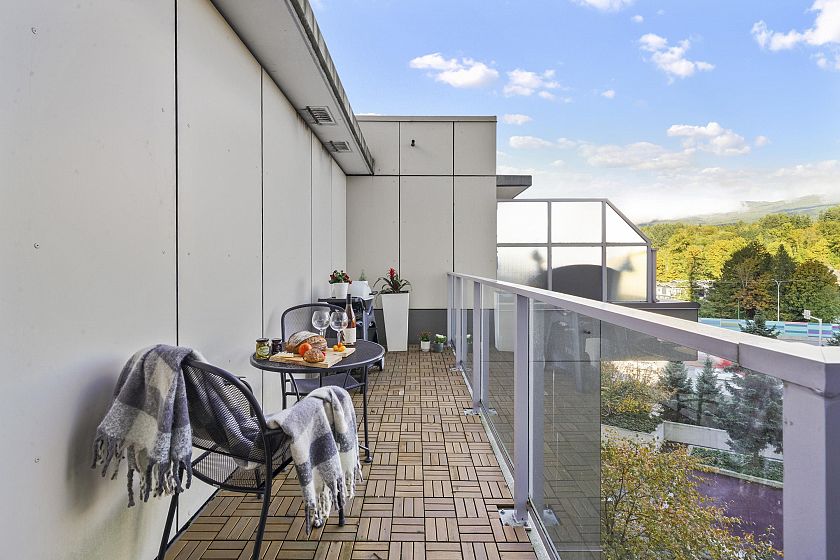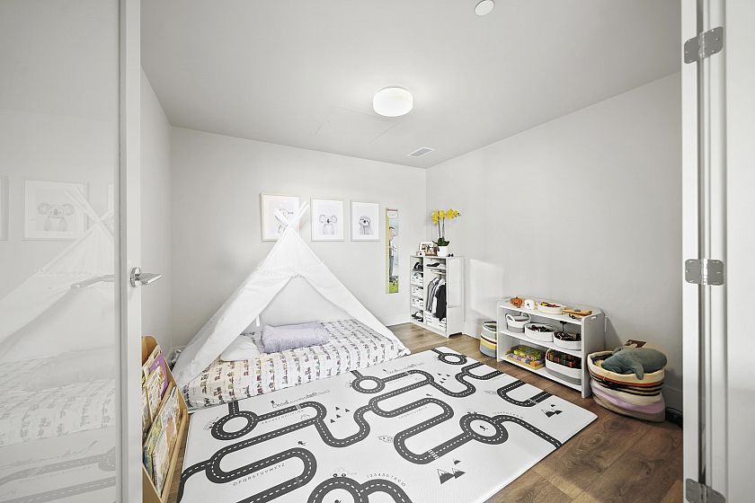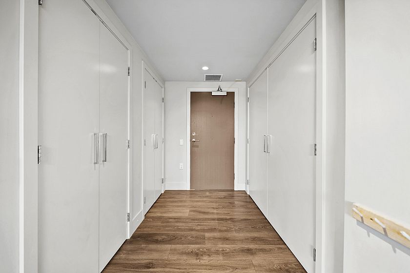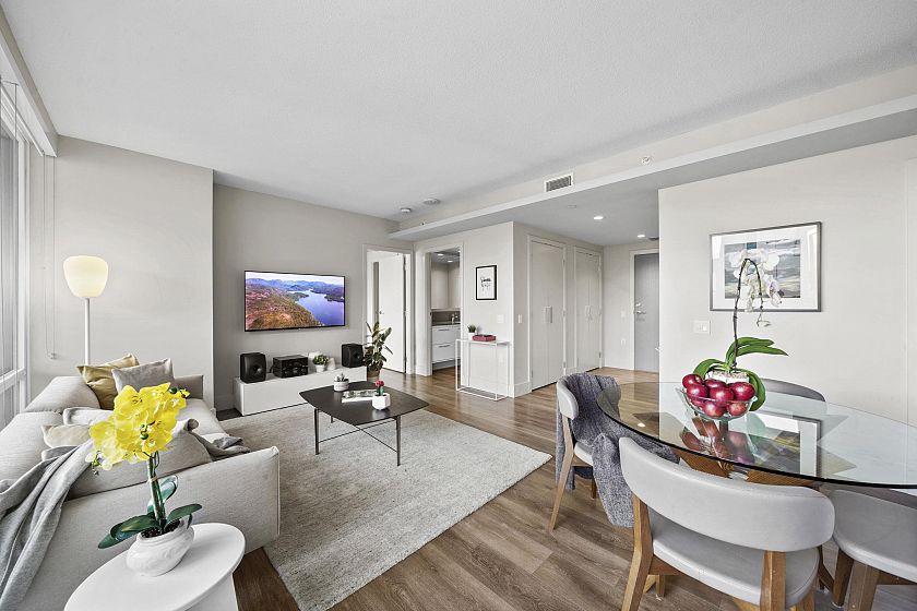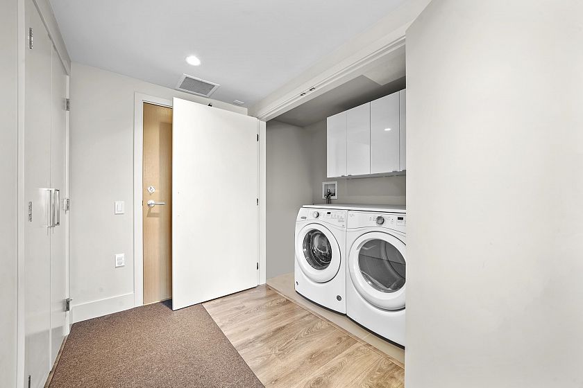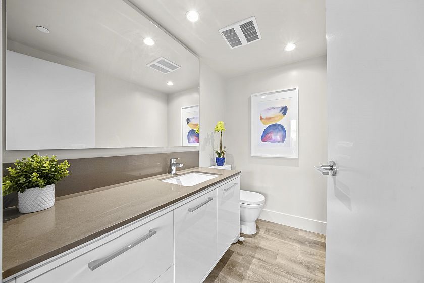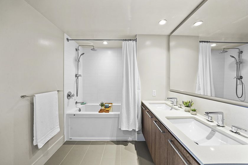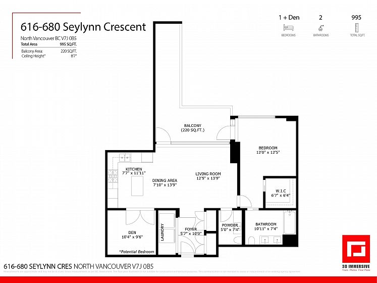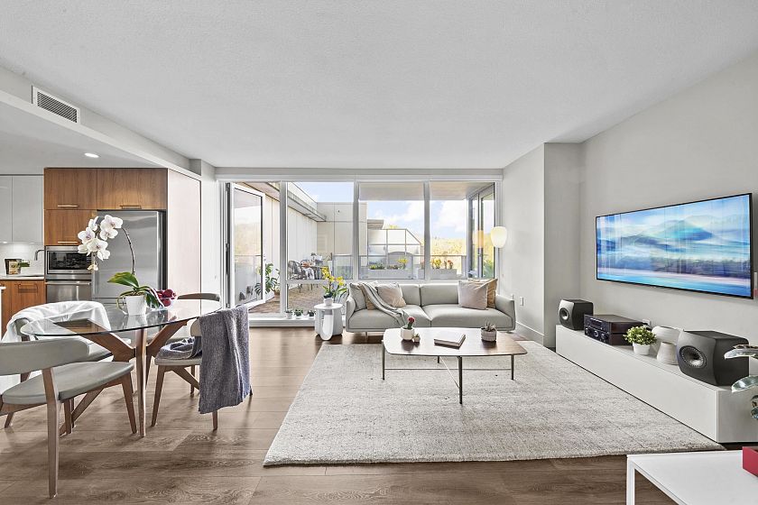 Resort-style living-rare North-facing home: where over-height ceilings & floor-to-ceiling triple pane windows showcase breathtaking mountain views! 1 of only 4 homes of this unique layout, features oversized rooms & expansive 220SF L-shaped balcony—the perfect place to enjoy the morning sunrise or unwind under the evening glow. Bright open-concept offers spacious primary bedrm w/ a walk-in closet & a spa-inspired ensuite complete w/ double sinks. Opposite side, a large den easily functions as a 2nd bedroom or home office, a powder room for guests. Chef’s kitchen w/ Bosch gas cooktop, Fisher&Paykel S/S refrigerator, modern backsplash, Quartz countertops & ample custom floor to ceiling cabinetry. A/C, private bike locker, wheelchair accessibility &more! Make this your own NorthShore retreat!