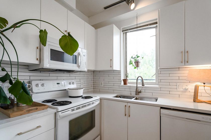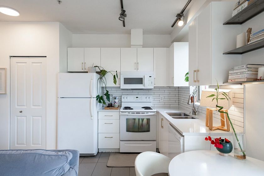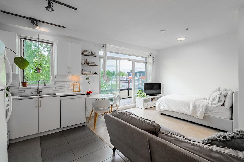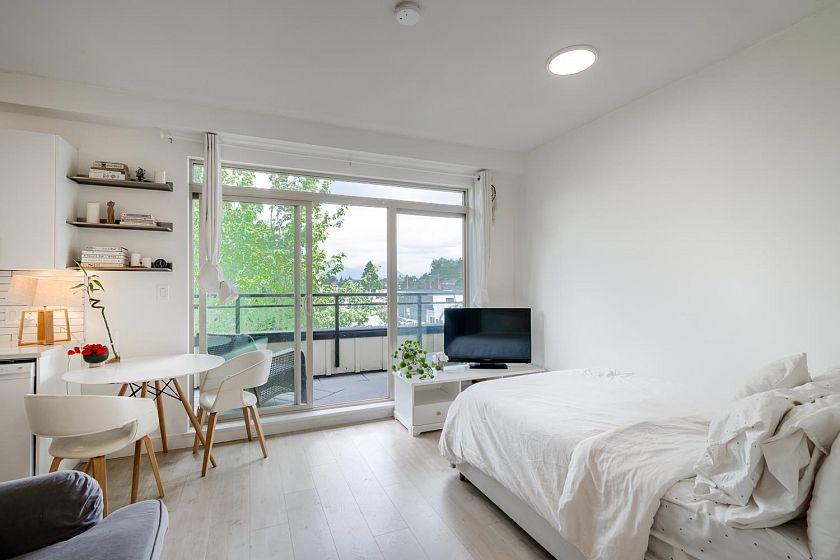 Welcome home to this north-facing penthouse studio with a private 168sf patio! This is the perfect starter home or could be a great investment for someone wanting to grow their Real Estate portfolio. This home greets you with new laminate flooring, fresh paint, updated quartz counters & some updated appliances, while the overheight ceiling & large windows brighten up the space w/ plenty of natural light. Step outside onto your oversized patio which boast beautiful views of the NS Mtns. This boutique building is situated in the heart of Fraserhood and within walking distance to all our favourite places - Matchstick, Jaybird, Savio Volpe, Earnest Ice Cream, grocery stores, parks - and just a short drive to the city, beaches, and more!