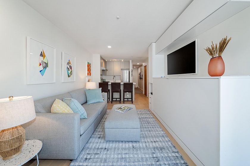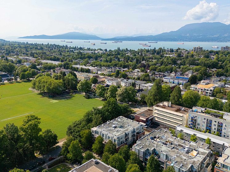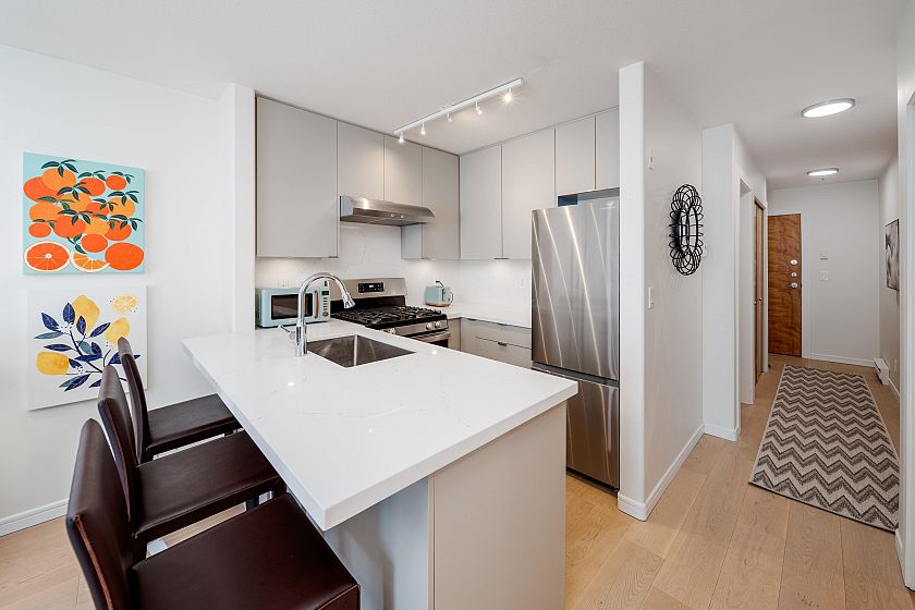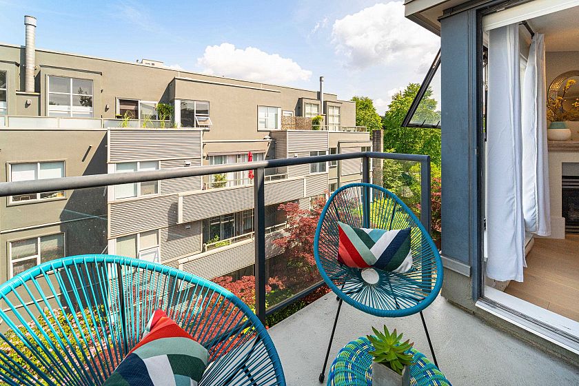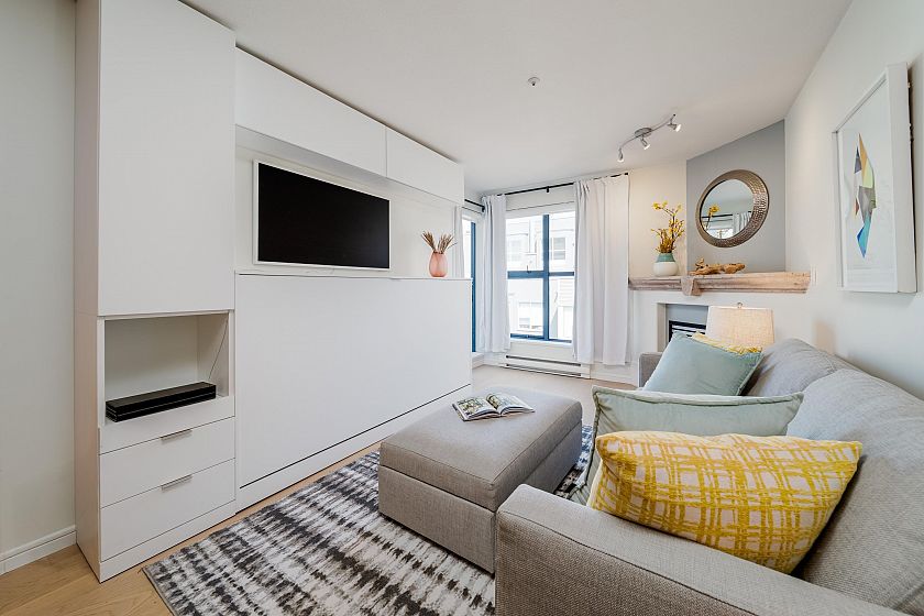 Top-floor 1 bed + den in sought-after Arbutus Walk, Kitsilano. Featuring a private balcony in this bright, quiet home with cozy gas fireplace & spacious layout. Kitchen boasts quartz countertops, gas stove, & stainless appliances. Custom wall bed, brand new bathroom renovation, and EV outlet in the parking spot add modern comfort and convenience. Ample storage, in-suite laundry & flex space make it ideal for work-from-home or lifestyle versatility. Located across from the Arbutus Greenway & steps to Kits Community Centre, cafes, shops, transit, & future SkyTrain. Includes 1 parking, bike locker, & access to gym/lounge. Rentals & pets allowed. A rare find in a prime location! Open House Sat Nov 8th 3:30-4:30pm