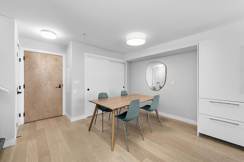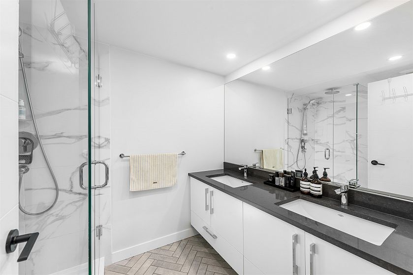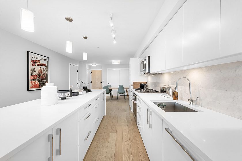 Top-floor corner penthouse in the heart of Mt. Pleasant! This bright & modern 1 bed, 2 bath home features a spacious open-concept layout with wide-plank flooring & oversized windows that flood the space with natural light. The sleek chef’s kitchen includes a large island, quartz countertops, Carrara marble backsplash, & high-end integrated appliances. The generous bedroom offers a walk-through closet & a spa-inspired ensuite with double vanity & herringbone tile. Enjoy spectacular North Shore mountain & city views from your massive private rooftop patio—complete with a gas line for BBQs, perfect for entertaining. Located in a boutique 35-unit building at Broadway & Fraser, steps to cafés, parks, transit, & Main Street. Includes 1 parking, 3 large storage lockers, & 2 bike lockers.
