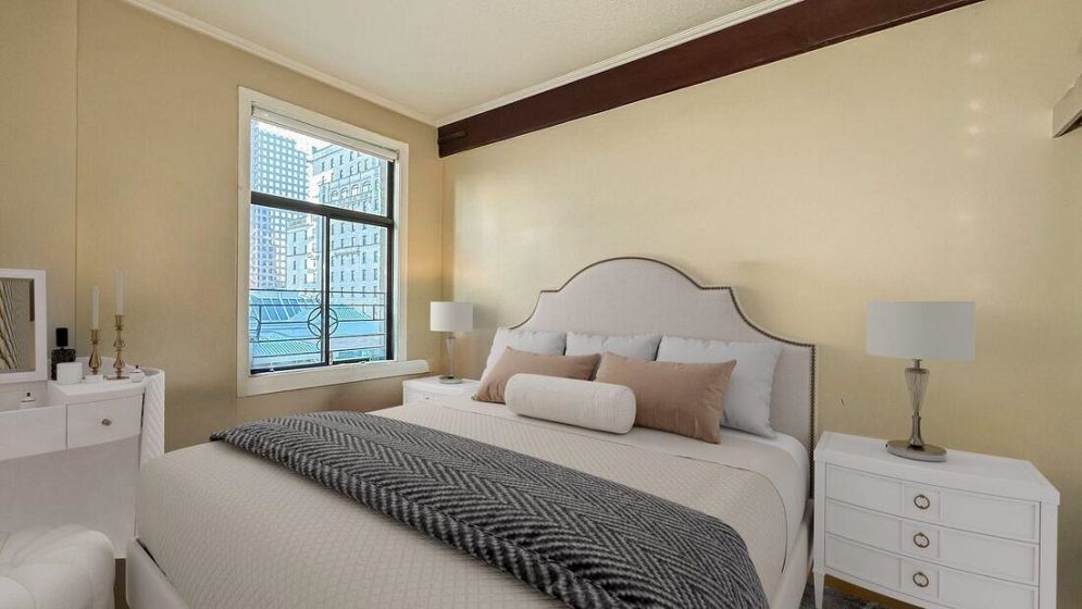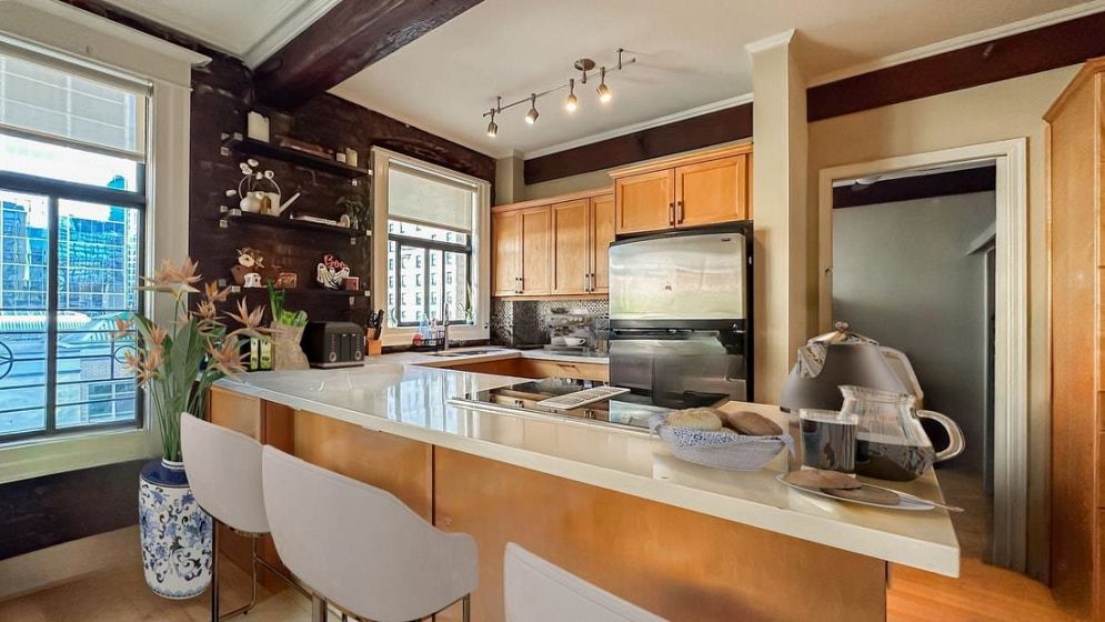 Welcome to 777 Burrard Street — a stunning New York–style loft penthouse that seamlessly blends heritage charm with modern sophistication. This bright northeast facing home showcases exposed brick, old-growth Douglas Fir beams, wainscoting, coffered ceilings, and large windows framing views of the Hotel Vancouver. The upgraded open kitchen is ideal for entertaining, complemented by a spacious living area and a versatile den currently used as a second bedroom. Nestled in an iconic, well-managed, re-piped heritage building converted to strata in 1981, it’s steps from world-class shopping, dining, and entertainment. Enjoy morning coffee on Robson or a nightcap after a show — your quiet urban retreat awaits. Cats welcome & including one storage locker. Parking available to rent offsite.