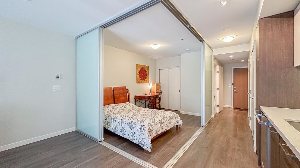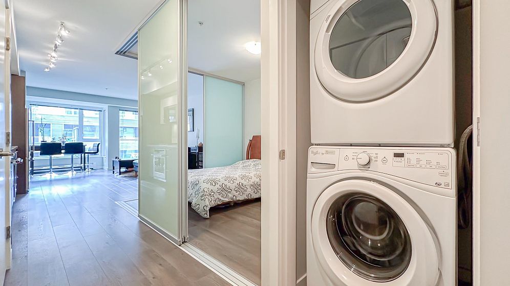 Welcome to CANVAS by Omni! Well maintained 1 bed/bath unit features an open-concept living, functional & spacious layout, modern kitchen with full-sized stainless steel appliances including gas cooktop. Covered balcony overlooking south facing QUIET COURTYARD. Amenities include a fully equipped gym, party room, garden plot, workshop & bike room. Centrally located in vibrant Mount Pleasant neighbourhood, steps from restaurants, farmer's market, cafes, new Skytrain station-The Great Northern Way-Emily Carr University, Science World, future St. Paul Hospital. 1 parking stall & 1 locker included.