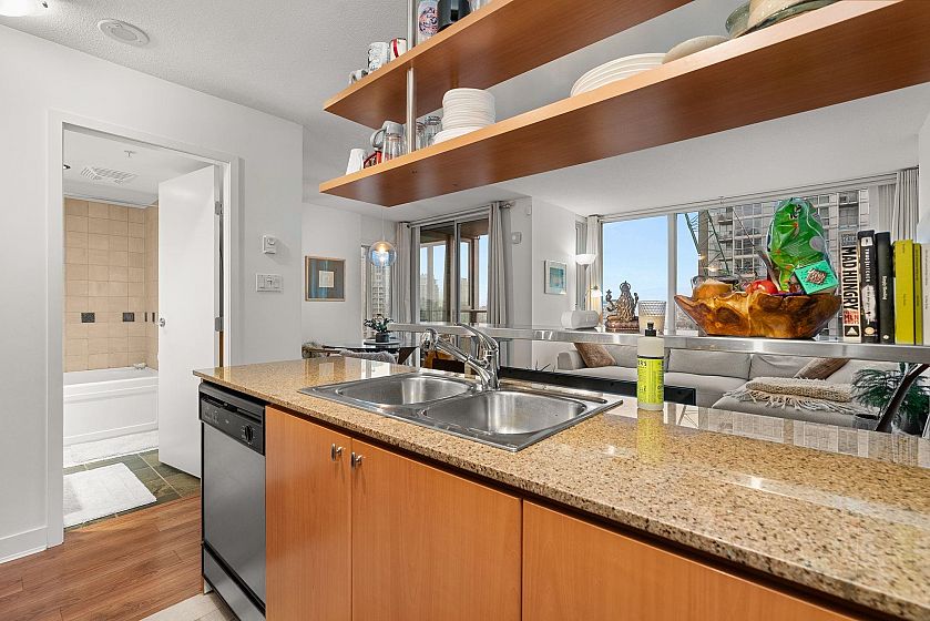 Welcome to this spacious and beautifully laid out 1-bedroom l bathroom unit complete with a versatile den/ office in the heart of highly sought-after Yaletown. Just steps to the seawall, this bright residence features floor-to-ceiling windows, hardwood floors, and serene views of False Creek. The thoughtful layout offers generous living and dining spaces along with exceptional storage, including a rare full-size in-suite storage room. Located in a coveted, amenity-rich building, you'll enjoy the best of urban living with convenience, comfort, and style all at your doorstep.