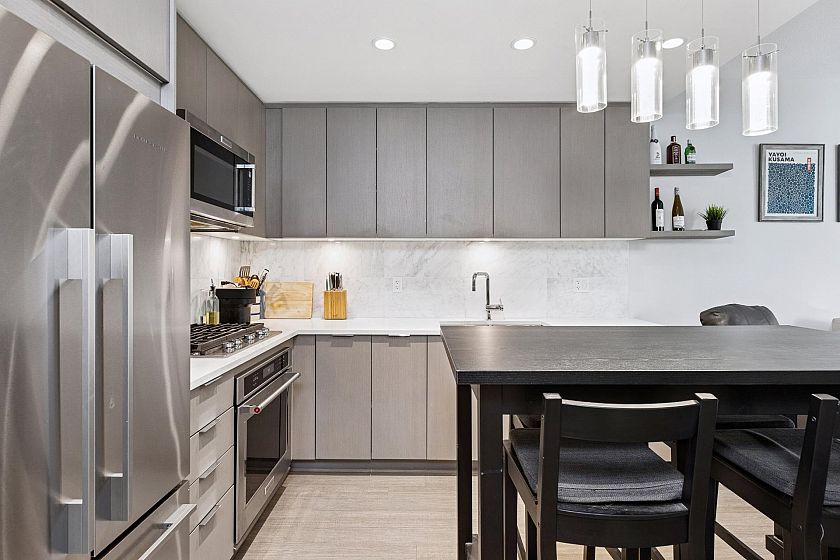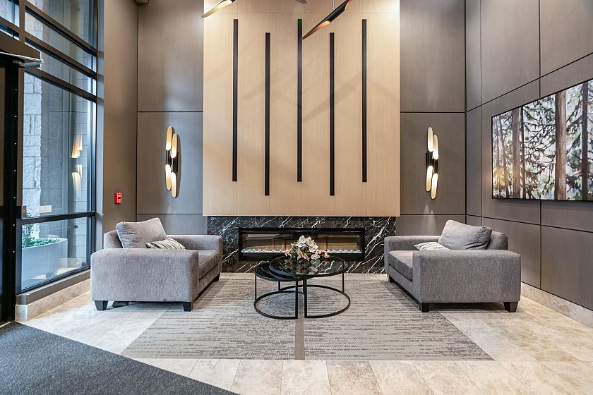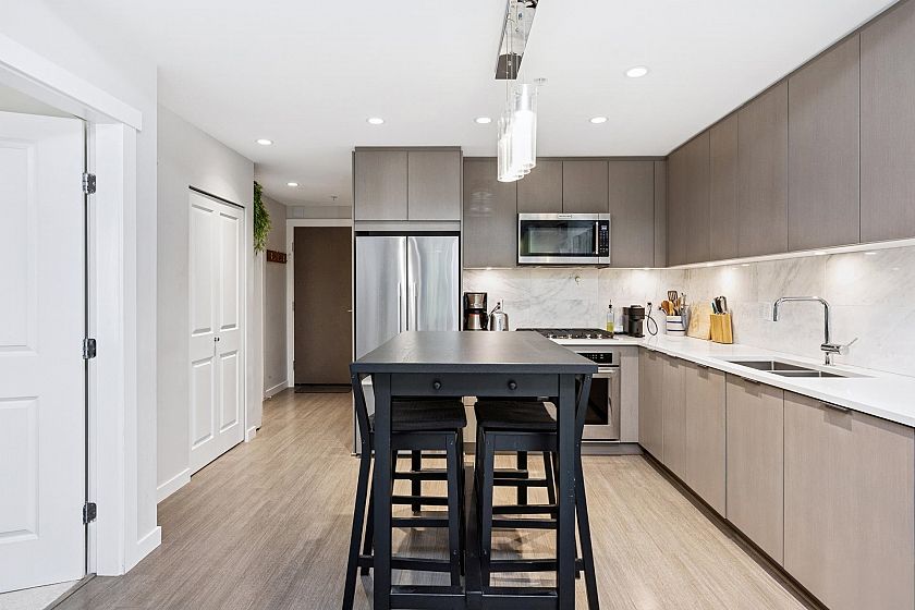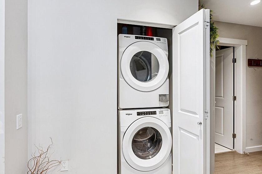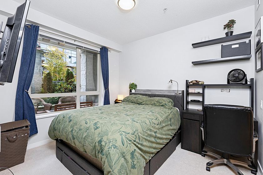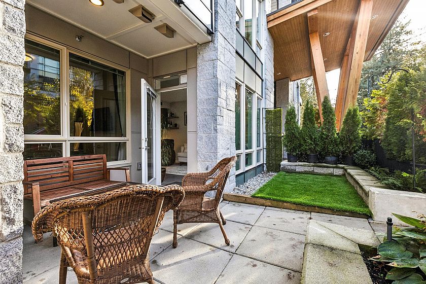 Townhome-Style 1 Bedroom + Den at Juniper by Polygon. Enjoy the perfect blend of townhome convenience and condo comfort in this patio-level home in the heart of Lynn Valley. The open layout features a spacious living area and a stylish kitchen with quartz countertops, a marble backsplash, stainless steel appliances, gas cooktop, and room for a dining table or island. The bedroom includes two closets and semi-ensuite access to the 4-piece bath, while the den offers space for a home office or nursery. Step out to a sunny west-facing gated patio—ideal for barbecues or trail access. Includes in-suite laundry, parking, two lockers, and use of the gym, bike room, and dog wash. Steps to Lynn Valley Centre, cafés, and schools, this home defines easy North Shore living.