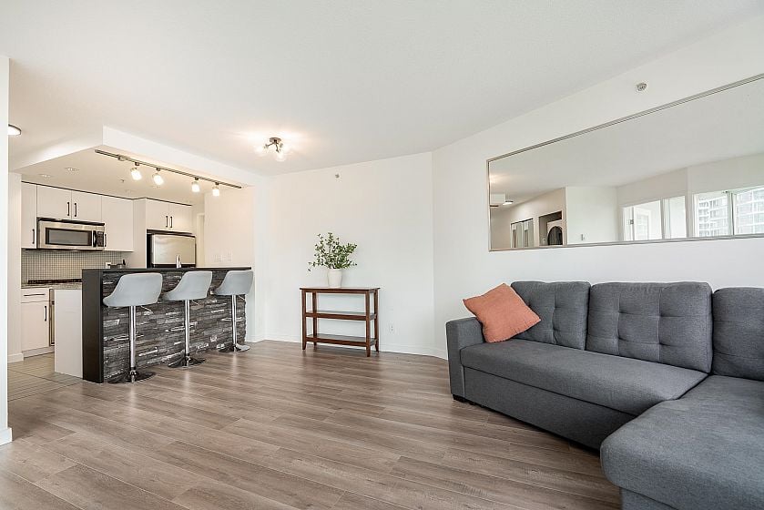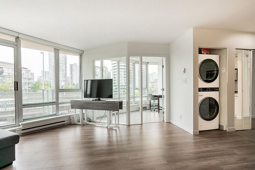 Coopers Pointe by CONCORD PACIFIC. This bright & spacious 1 Bed + Den end unit offers 730 sqft of thoughtfully designed living space. The kitchen features refinished cabinetry, granite countertops, stainless steel appliances, & gas cooktop. Recent updates include brand-new flooring, fresh paint, new washer/dryer & a beautifully updated 4-piece bathroom w/ marble countertops. Generous primary bedroom comfortably fits a king-size bed, while a bonus pantry provides valuable extra storage. Enjoy world-class amenities: concierge service, clubhouse, indoor pool, sauna/steam room, hot tub, bowling alley, 2 gyms, party rooms, theatre & more. Perfectly located on a quiet corner, just steps to the Seawall, parks, PARQ Casino, Urban Fare & Yaletown’s top restaurants. Pets welcome! Private EV Charger!