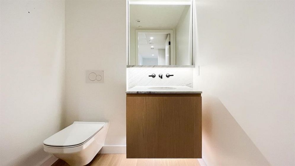 Mirabel by Marcon, rare 1 bedroom floor plan with 1 full bath ensuite + powder room. Feature 13'3" extra high ceiling, make the unit more spacious with lots of natural light. Patio opens to roof garden. It features high-end appliances, quartz counter tops, built-in safe, geothermal heating & A/C, exercise room, outdoor playground and roof garden. Walking distances to water front, restaurants, shopping, parks and more. No Parking, One storage locker.
