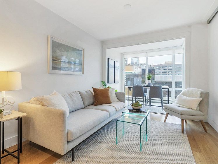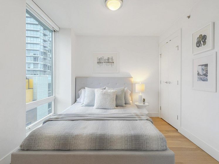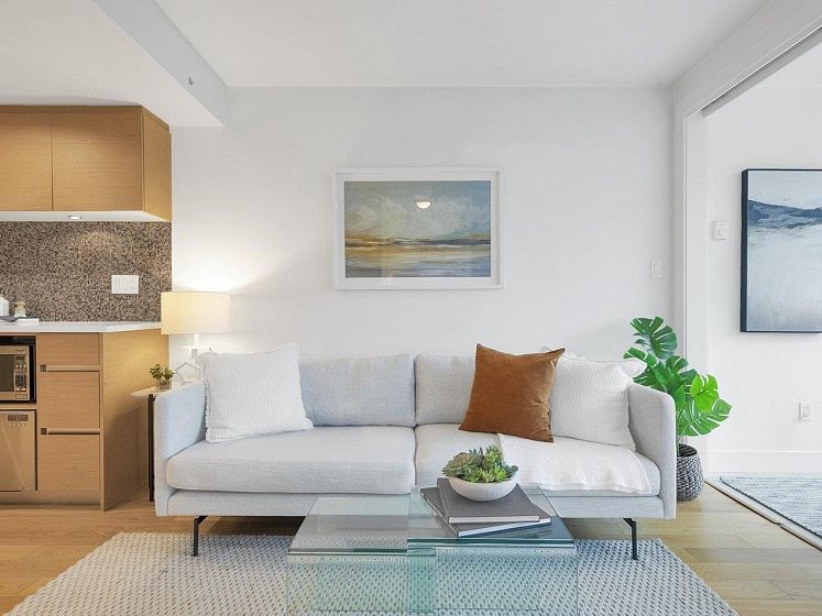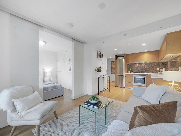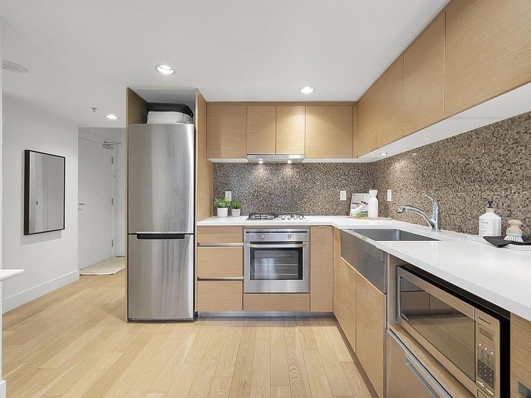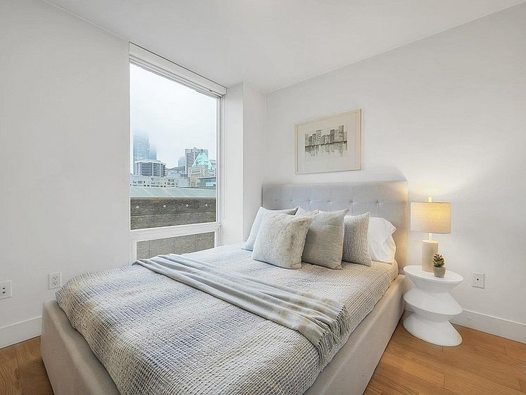 Luxury Georgia award winning well maintained concrete building by Solterra. NW facing with open city views, bright and spacious. Great layout with good sized bedroom. Den is big enough as occasion guest room. Beautiful solarium is great for flex/work space. Modern furnishing, wood cabinets, trendy back splash, gas cooktop, engineered wood floors, stainless steel appliances, in suite laundry. Secured building with concierge in the spacious lobby. Gym, lounge, playground etc. Sought after location, 10/10 walking score. Comes with 1 parking & locker.