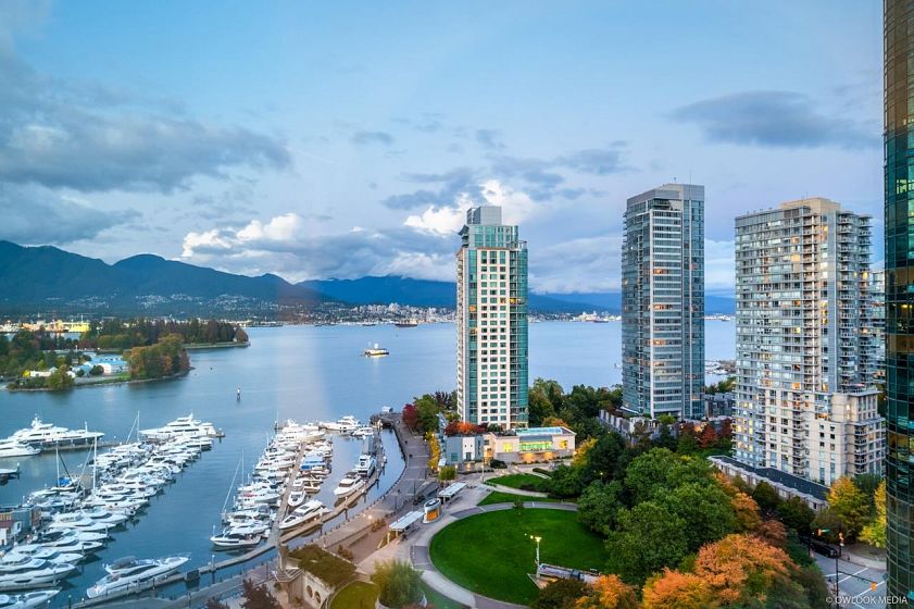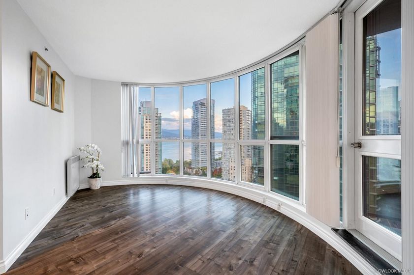 Semi Waterfront property with spectacular water, mountains & marina views. Harbourside Park is the masterpiece building designed by Arthur Erikson. One Bedroom and den, 667 SF corner unit with open balcony. Enjoy city living at its best in this private setting. Superb layout with floor to ceiling windows in LR. Spacious master bedroom with a separate area for office. Nice size balcony facing park and marina. On site management, Indoor swimming pool, rec centre, bike storage & visitor parking, just steps from seawall, community centre, marina & Stanley Park. Pets allowed, rent allowed.