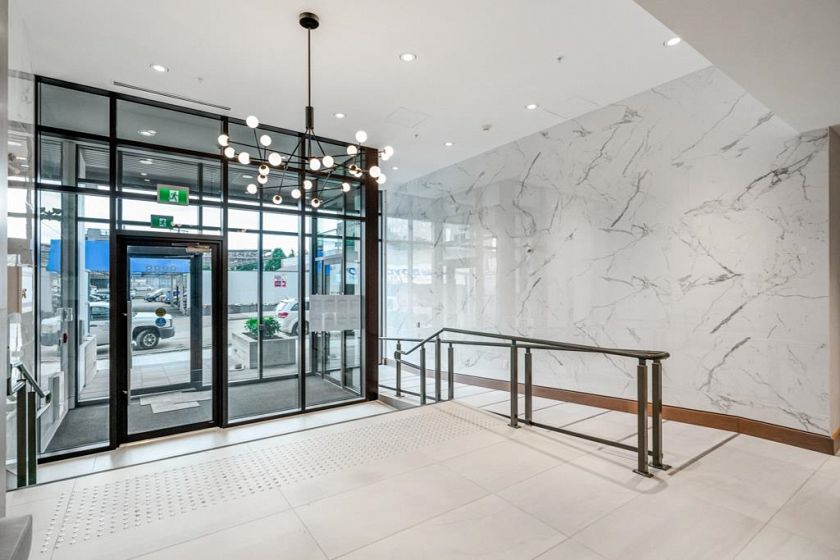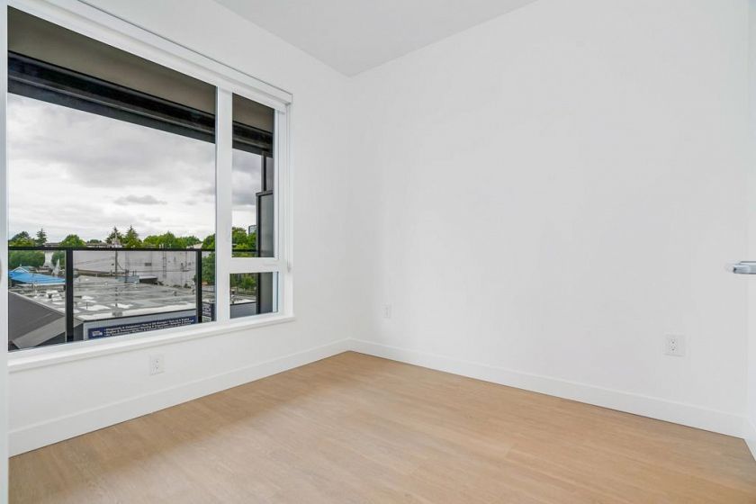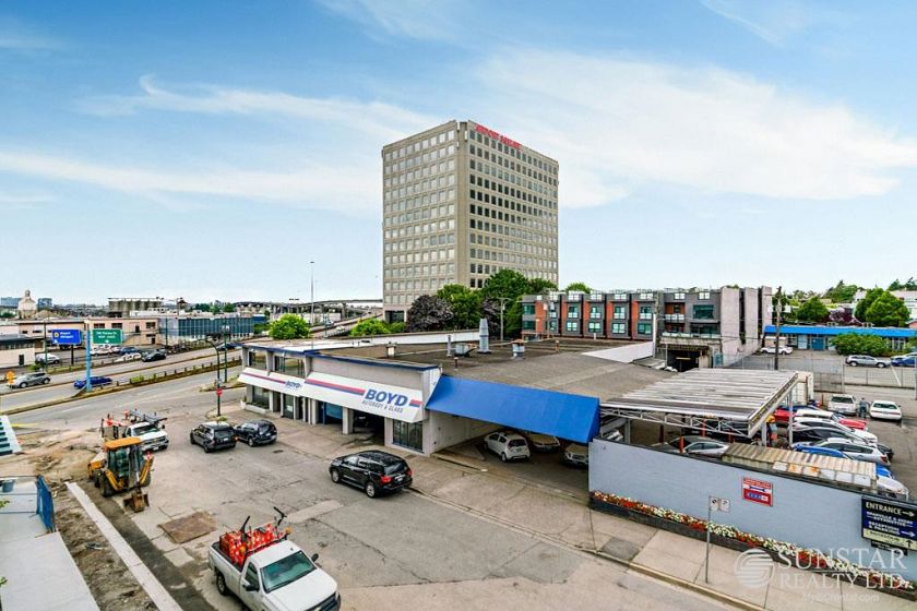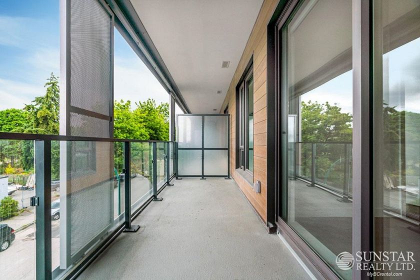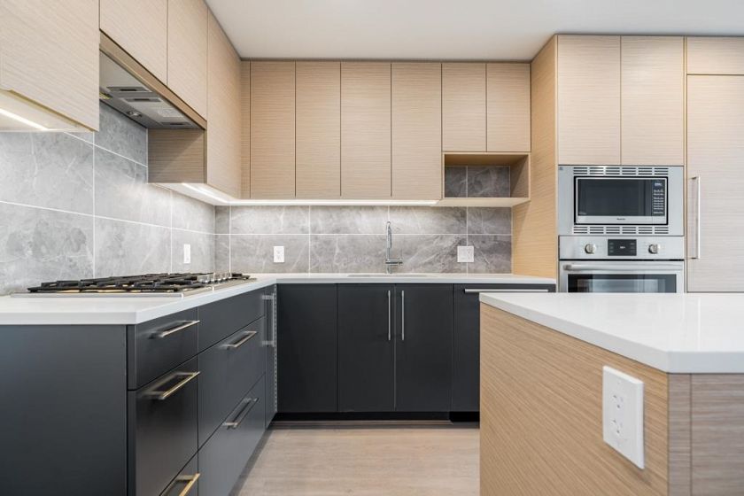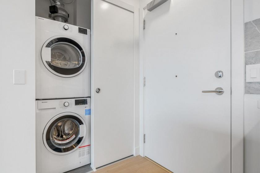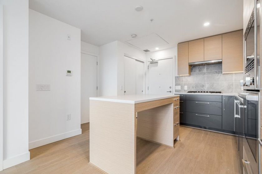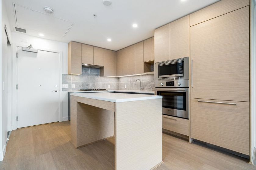 Luxurious 1-bedroom unit with insuite heating/cooling, laminate floors, and roller blinds. The functional layout maximizes space, with a spacious living-dining area opening to a 100 sq. ft. covered balcony. The high-end kitchen includes two-toned cabinetry, quartz countertops, Carrara marble-style backsplash, Grohe faucet, under-cabinet lighting, a center island doubling as a dining table, and Bosch appliances, including a 30" gas cooktop. The bedroom overlooks the balcony and has two walk-through closets. The 4-piece bathroom, accessible from both the bedroom and kitchen, features quartz counters, tiled walls, custom shelving, a Kohler toilet, a soaker tub, and a frameless glass enclosure. Rent includes 1 parking stall and 1 storage locker.