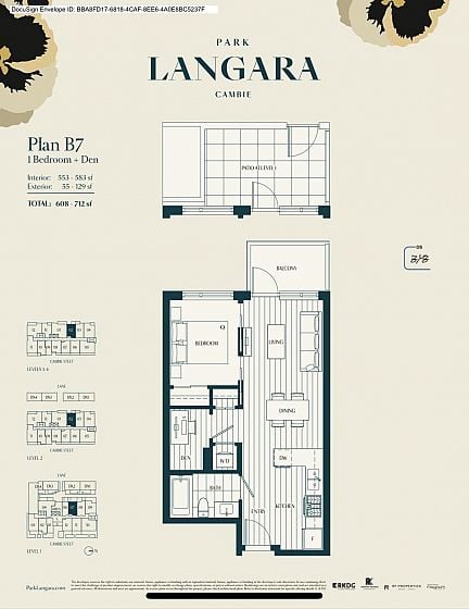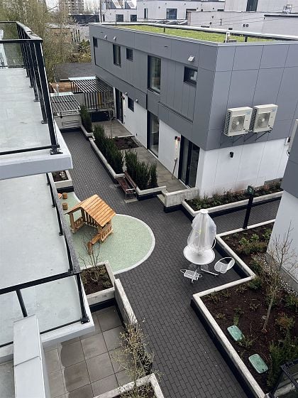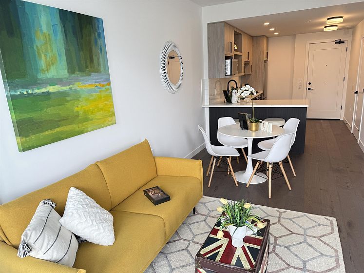 LOCATION! LOCATION! LOCATION! Concrete built property!!! This brand-new 1-bedroom + 1 den home faces a quiet inner street, offering both comfort and privacy. It features modern cabinetry, hard wood flooring, quartz countertops, high ceilings, and central air conditioning. The den is flexible - ideal as a home office or a guest room with a single bed. Includes 1 parking stall and 1 bike storage rack, plus full coverage under the 2-5-10 New Home Warranty. 5-minute walk to Langara - 49th Canada Line Station, offering direct access to Downtown, Richmond, and YVR Airport. Only 15 minutes walk to the future Oakridge Centre. With in walking distance to top-ranked schools, including Dr. Annie B. Jamieson Elementary and Sir Winston Churchill Secondary (IB program) .