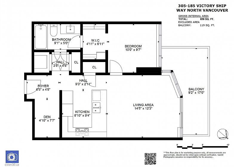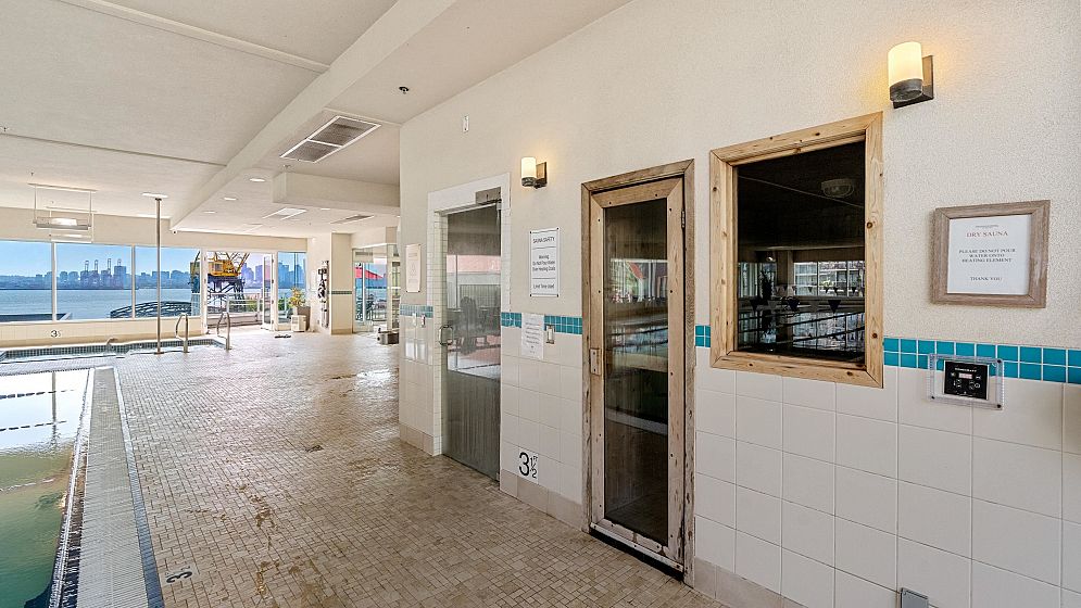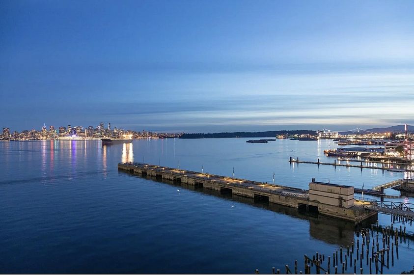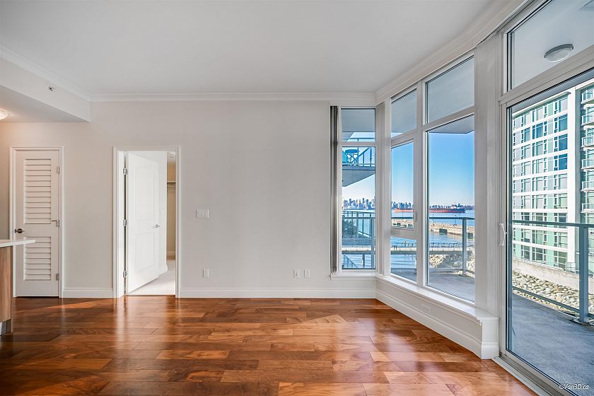 INVESTORS ALERT! Rented at $3200/month until the end of April 2026. BEST 1-BEDROOM VIEW - RARELY AVAILABLE 05 UNIT! This stunning west-facing unit offers 659 SQ.FT with 1 bedroom, 1 den, an ensuite bathroom with separate entrance, walkthrough closet, and a spacious balcony with some of the best ocean views Cascade at the Pier has to offer of the private beach, Vancouver Harbour, Stanley Park and Downtown Vancouver’s breathtaking skyline. Enjoy an open floor plan, gourmet Bosch kitchen with gas stove, integrated fridge/freezer, soft-close drawers, breakfast bar, 9’ ceilings, crown mouldings, A/C, and European finishes. Owners receive VIP Pinnacle Hotel perks: indoor pool, steam room, sauna, jacuzzi, and gym. Steps from Shipyards District, Lonsdale Quay, and endless dining/shopping.