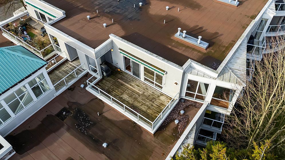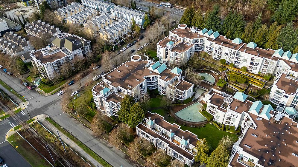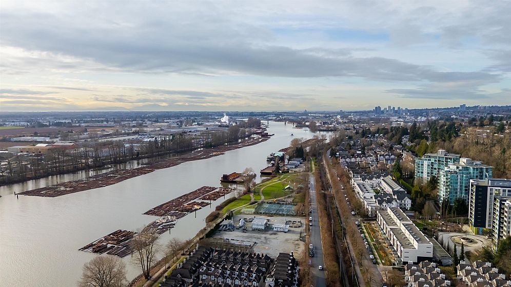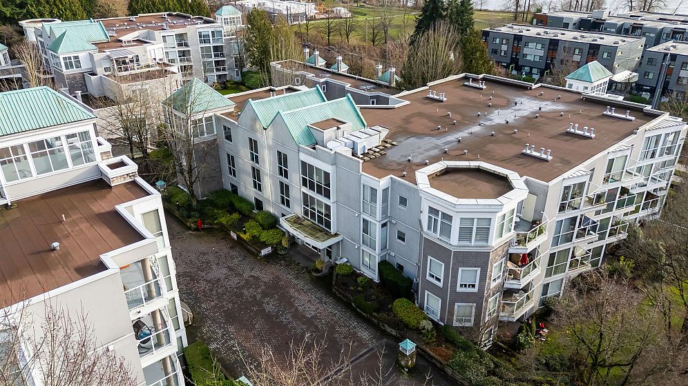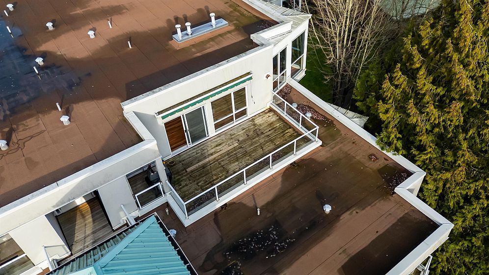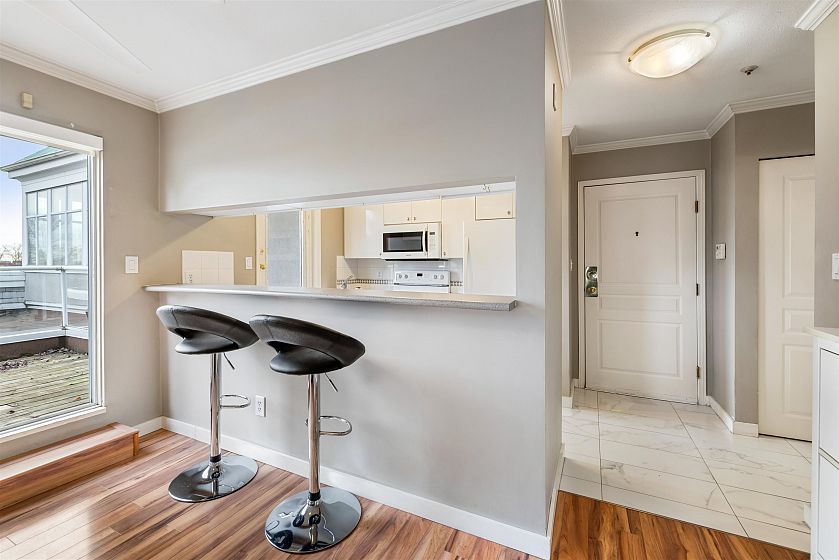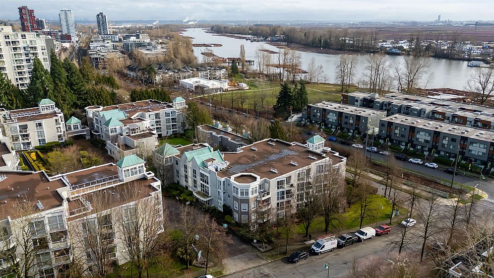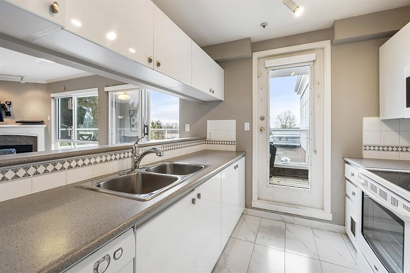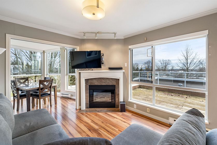 Penthouse with a View! Stunning sunset and river view from your private deck in this bright and spacious south-facing 1 bed+1 den /1 bath. Living room features a cozy gas fireplace and a wall of south-facing windows that flood the space with natural light. Kitchen opens to the dining area & includes direct access to the patio, perfect for easy outdoor entertaining. Large primary bedrm easily fits a king-size furniture suite. Incl. 2 parking stalls & locker, amenities incl. gym, guest suite. 5 min walk to the River Front Park along the river and enjoy the 14 acre park offering picnic areas, tennis courts & a sandy beach perfect for those who are active and pet lovers. Just steps from the vibrant River District with a variety of restaurants and shops. One of the best units in the complex!