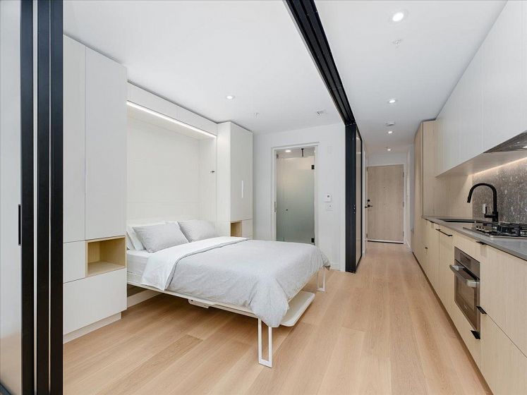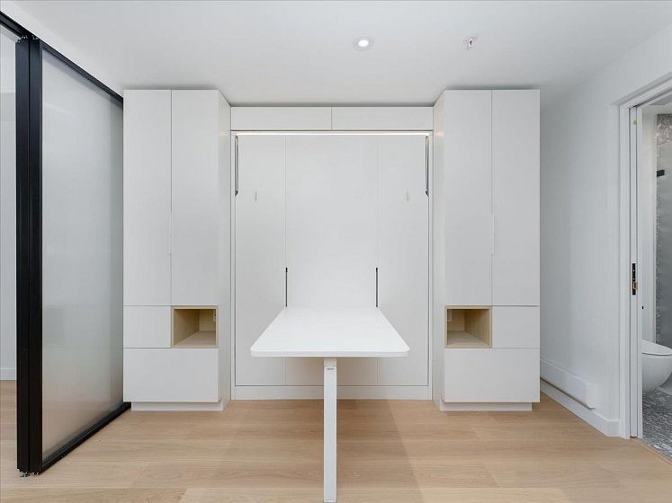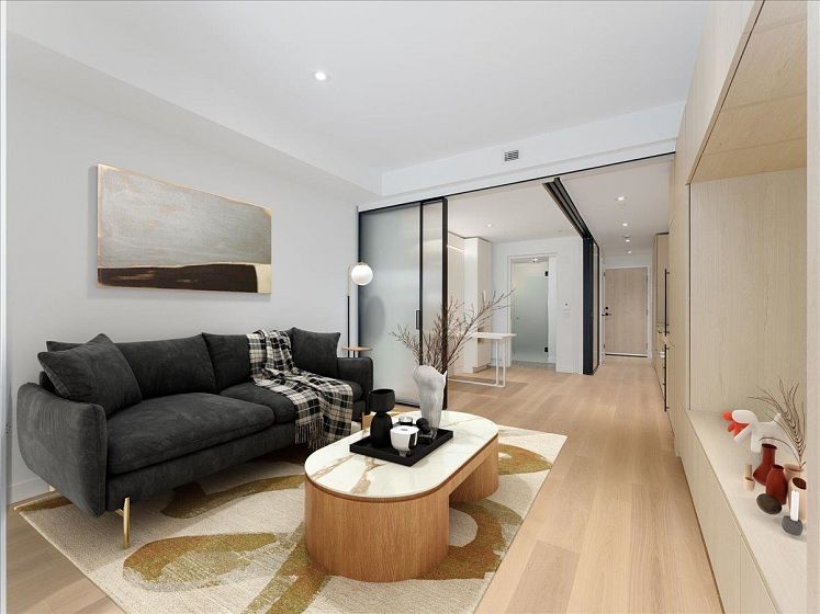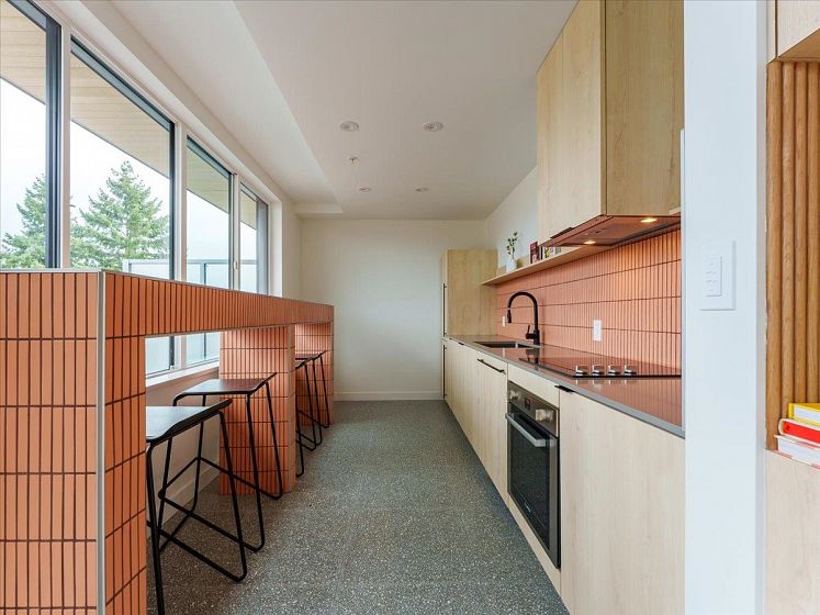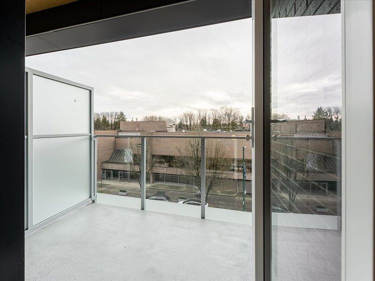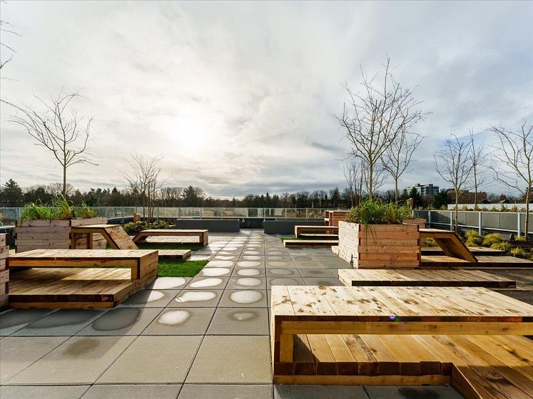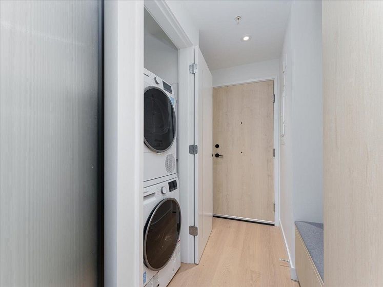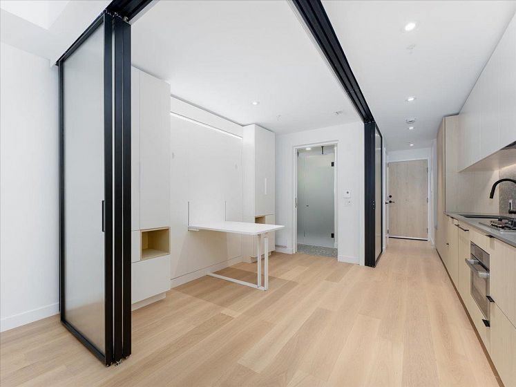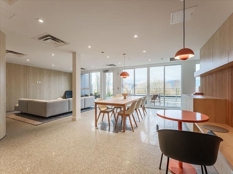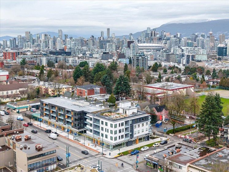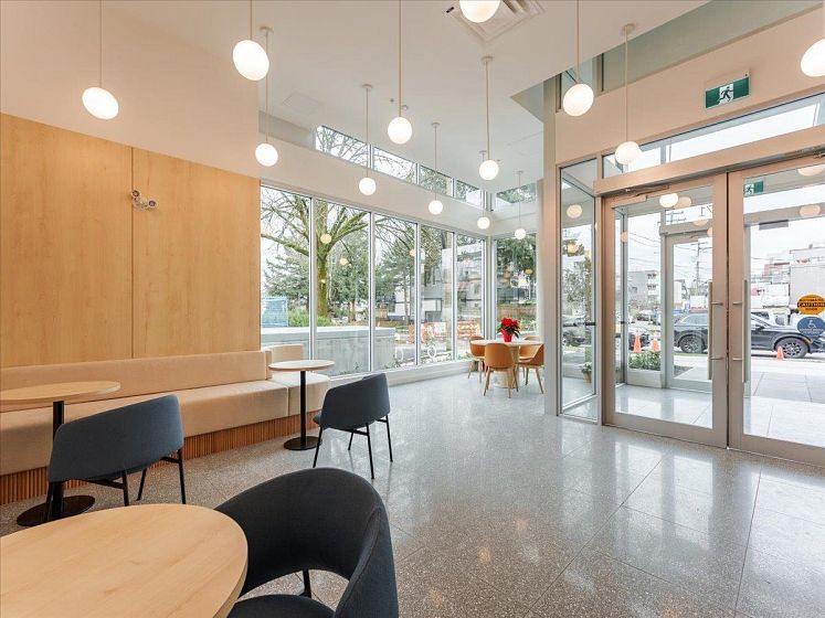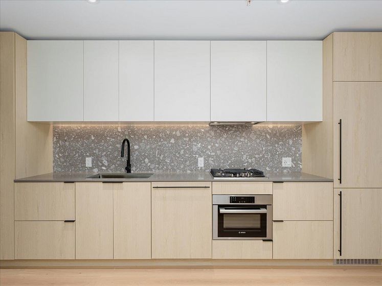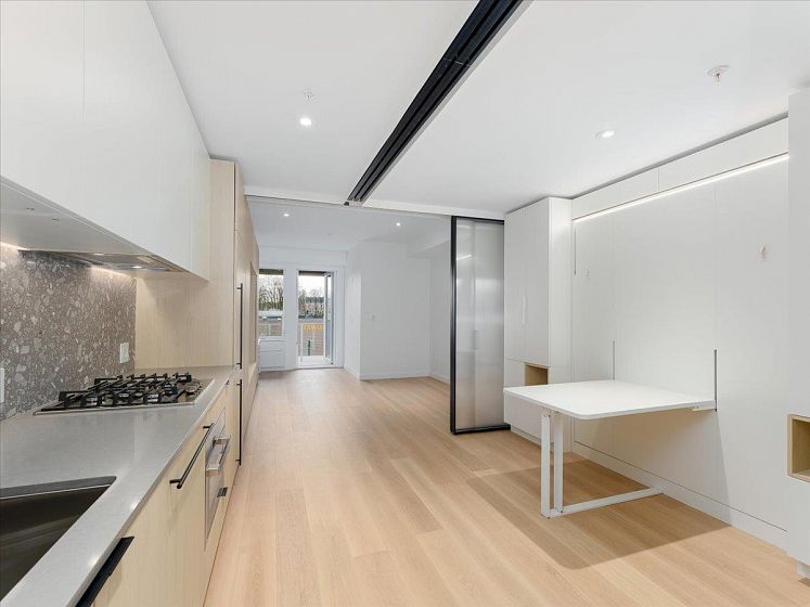 Brand-new top-floor south-facing condo at The Saint George by Reliance Properties-a boutique building that blends modern architecture with outstanding livability. Featuring over-height ceilings, oak millwork, wide-plank hardwood floors, terrazzo stone countertops, Bosch and Fulgor Milano appliances with gas range, AC, and generous balcony. Flexible floorplan with combo murphy bed/dining table, oversized sliding doors lets you enjoy open-concept living or a private one-bedroom layout with 2 bathrooms! Amenities include a rooftop deck with pizza oven, garden boxes, and 360 degree panoramic views, top-floor lounge w/terrace, bike rooms, visitor parking, and storage locker. Prime location steps to restaurants, cafes, breweries, Emily Carr University, Kingsgate Mall, and the future Skytrain!