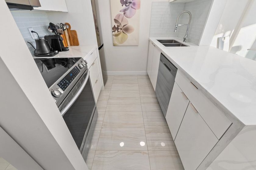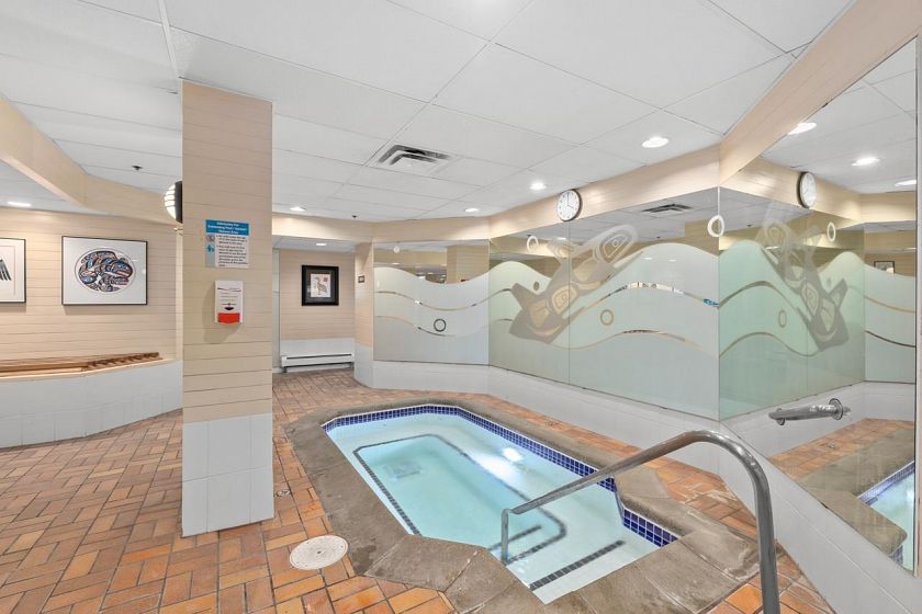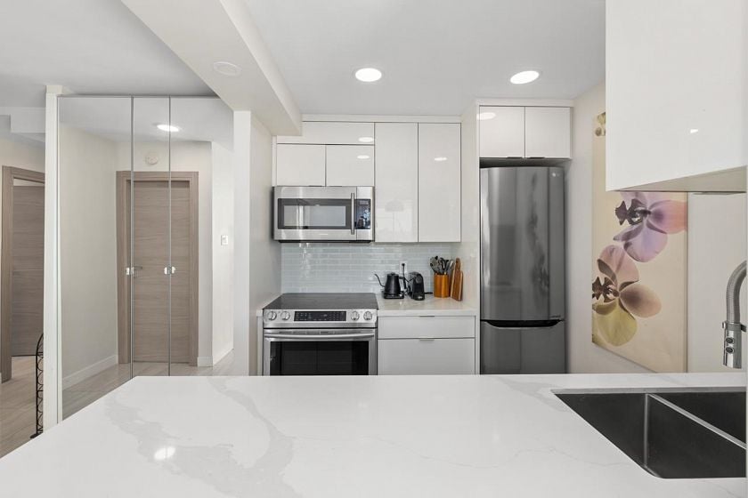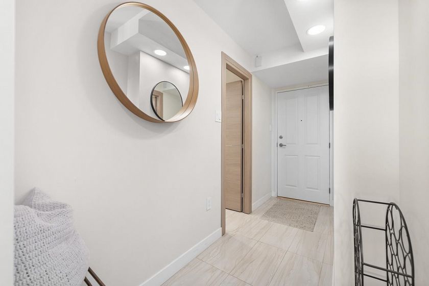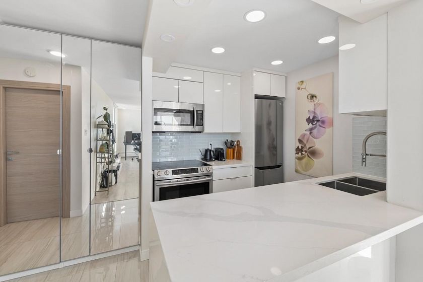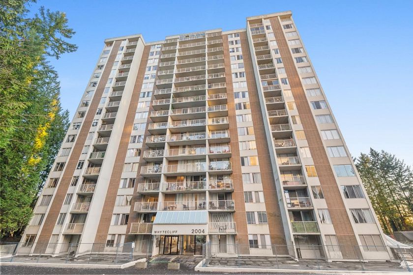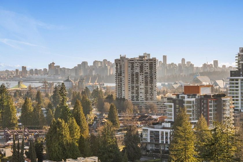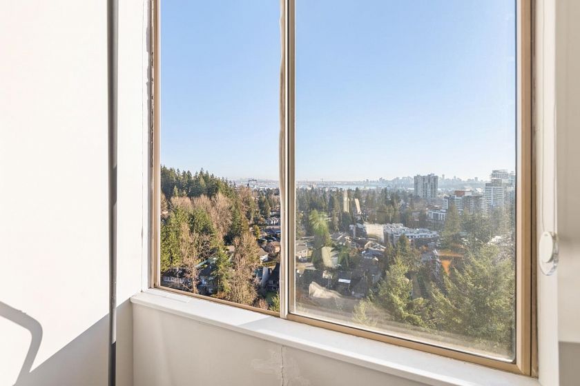 Bright, south-facing 1-bedroom, 1-bathroom home of refined living space with views of the city skyline and Lions Gate Bridge. Tastefully renovated from top to bottom, the open-concept kitchen features high-end finishes and a stainless steel appliance package, flowing seamlessly into the living area. A well-sized balcony overlooks mature trees, creating a peaceful outdoor retreat. Located in the Whytcliff building at Woodcroft, widely regarded as one of the best in the complex, with major infrastructure upgrades completed including hot and cold water plumbing replacement, elevator rebuilding, and roof replacement.