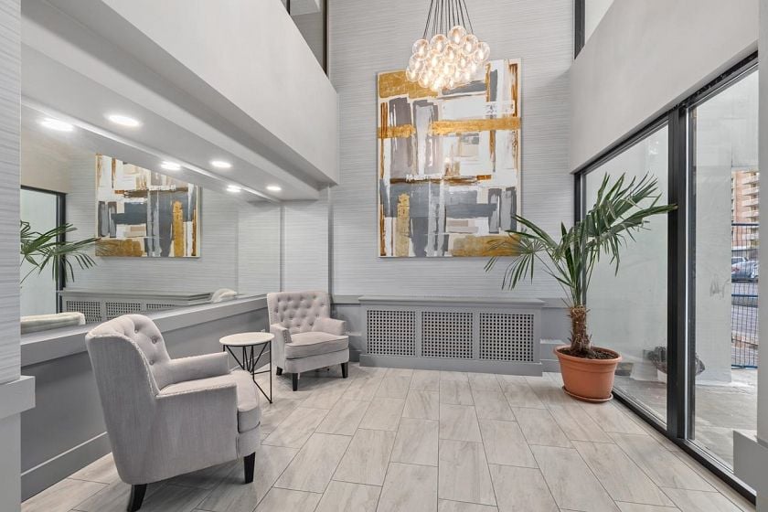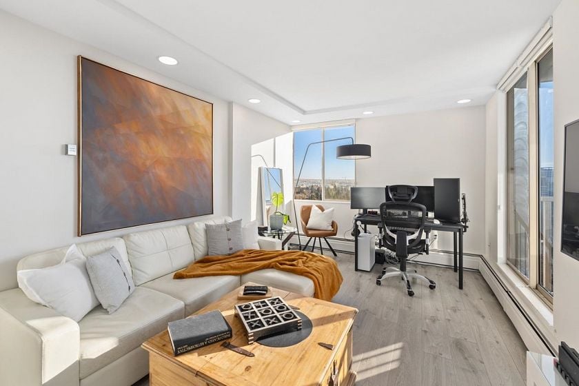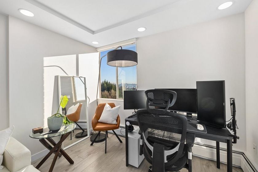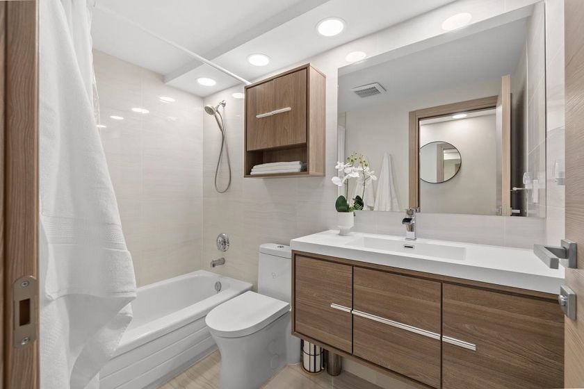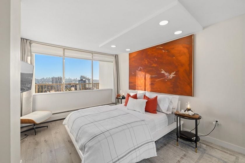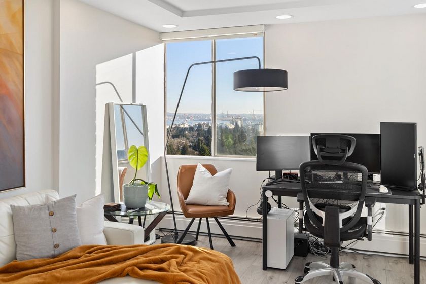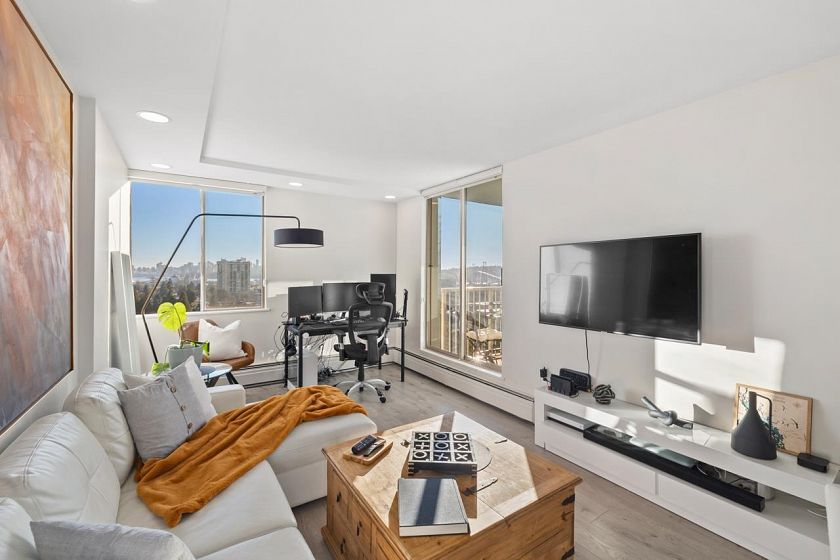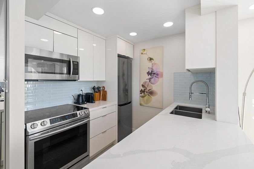 Bright, south-facing 1-bedroom, 1-bathroom home of refined living space with views of the city skyline and Lions Gate Bridge. Tastefully renovated from top to bottom, the open-concept kitchen features high-end finishes and a stainless steel appliance package, flowing seamlessly into the living area. A well-sized balcony overlooks mature trees, creating a peaceful outdoor retreat. Located in the Whytcliff building at Woodcroft, widely regarded as one of the best in the complex, with major infrastructure upgrades completed including hot and cold water plumbing replacement, elevator rebuilding, and roof replacement.