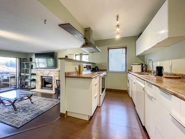 This quiet northeast corner suite is tucked away yet perfectly positioned just steps from everything the Vancouver West End has to offer. The bright, open layout features a renovated kitchen with newer appliances, laminate flooring throughout, an in-suite washer, and is offered fully furnished for easy move-in. Off the entry, the spacious sunken living room includes a cozy gas fireplace and opens onto a large covered balcony, ideal for year-round use. The bedroom comfortably fits a queen-size bed with room for additional furniture. The bathroom is original but well-maintained. Building amenities include a sauna and fitness room. One parking stall included. No pets permitted. Monthly rent includes heat and hot water. Available for immediate occupancy. Minimum 1-year lease.